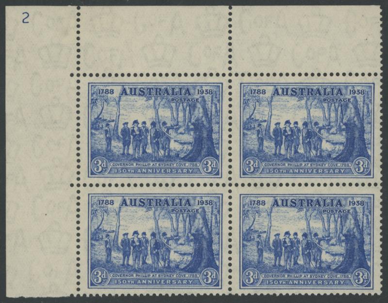 1937 NSW Sesquicentenary 3d blue SG 194 upper-left corner block of 4 with complete Plate Number ' 2 ' at upper-left unit, faint