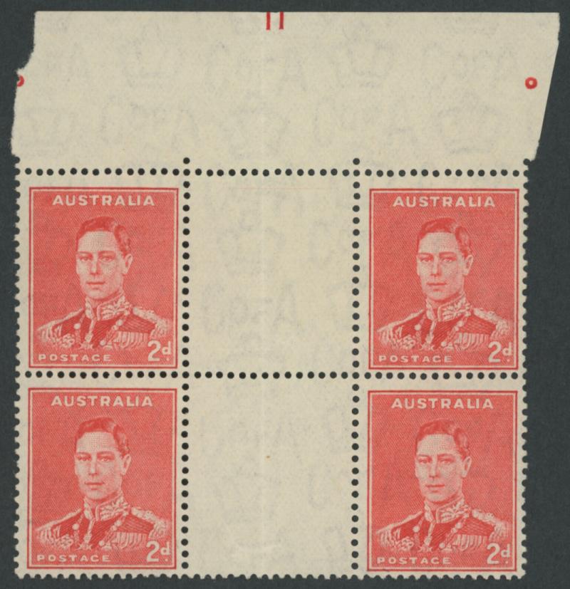 1937-49 Definitives Perf 15x14 KGVI 2d scarlet Die II SG 184 gutter block of 4 from the top of the sheet with complete Plate Number
