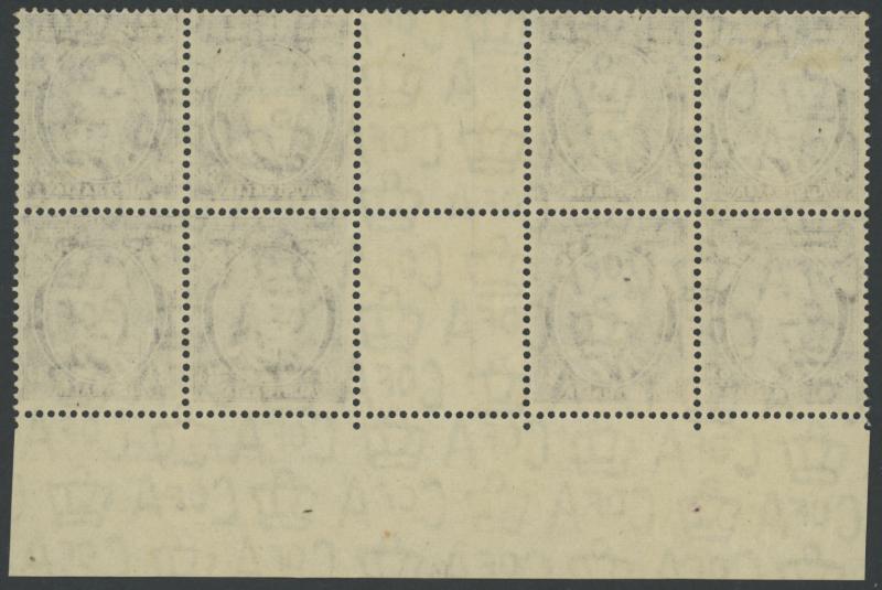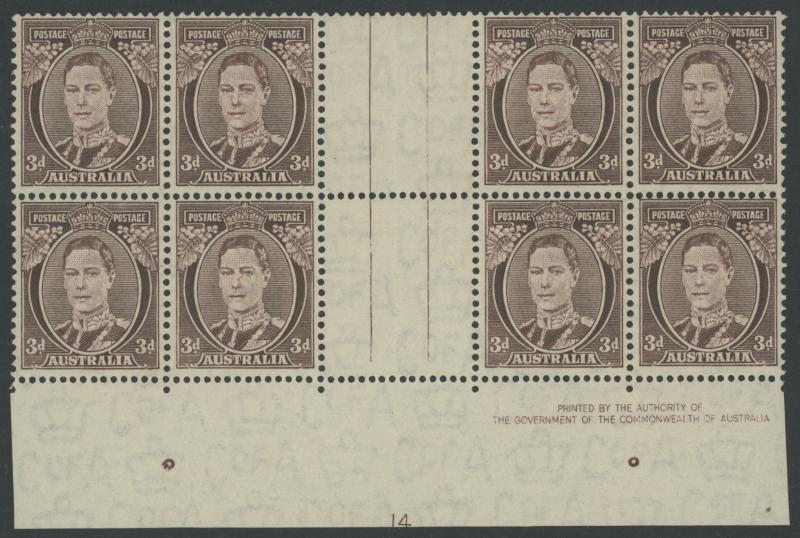 1937-49 Definitives Perf 15x14 KGVI 3d purple-brown SG 187 gutter block of 8 (4x2) with Authority Imprint and almost-complete (95%)