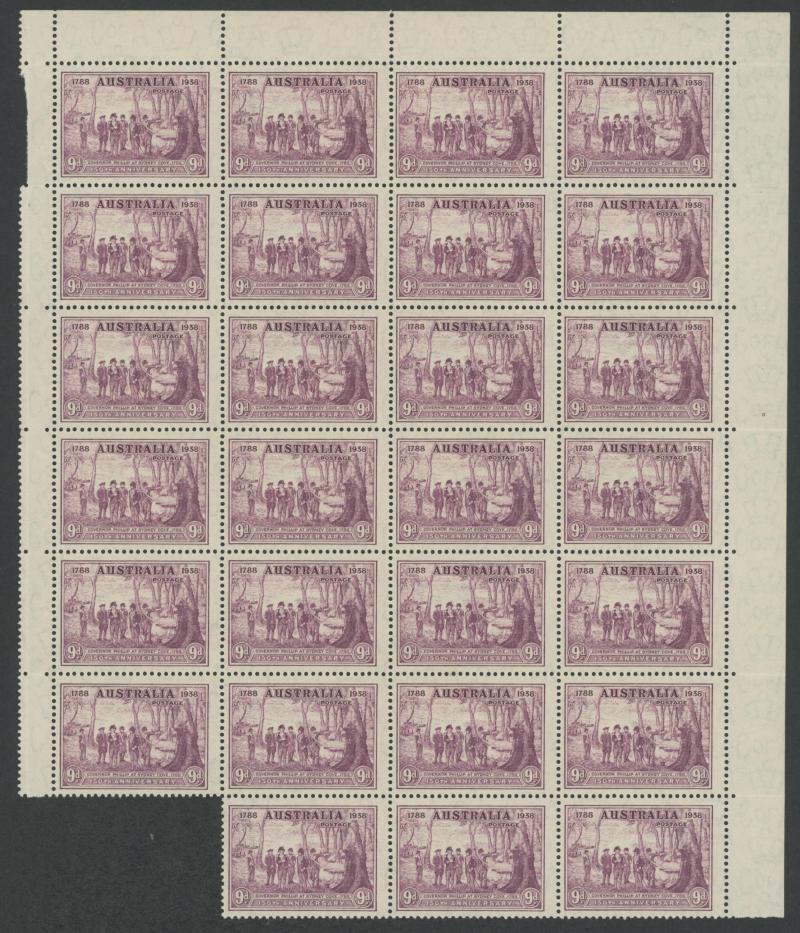 1937 NSW Sesquicentenary 9d violet SG 195 ACSC 177 block of 27 (4x7, missing the lower-left unit), two units mounted otherwise