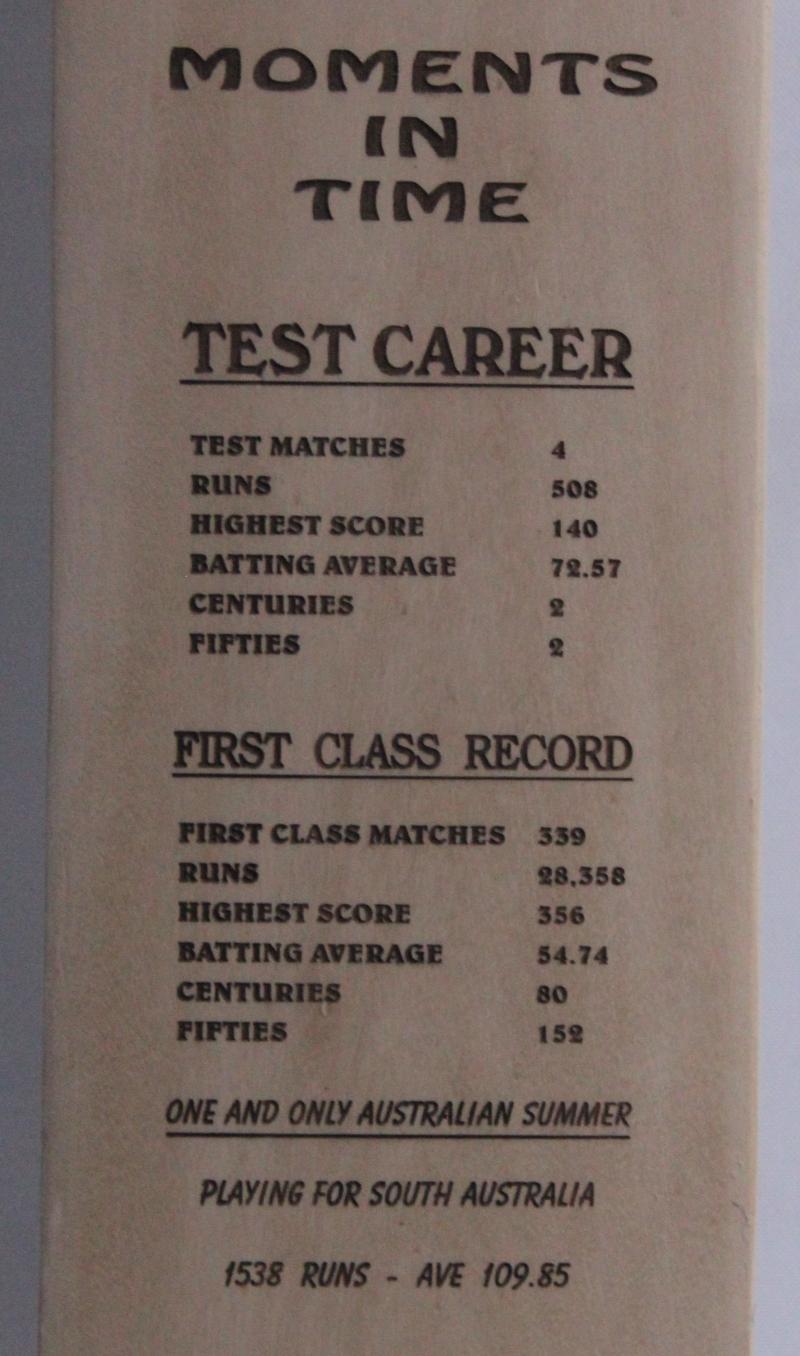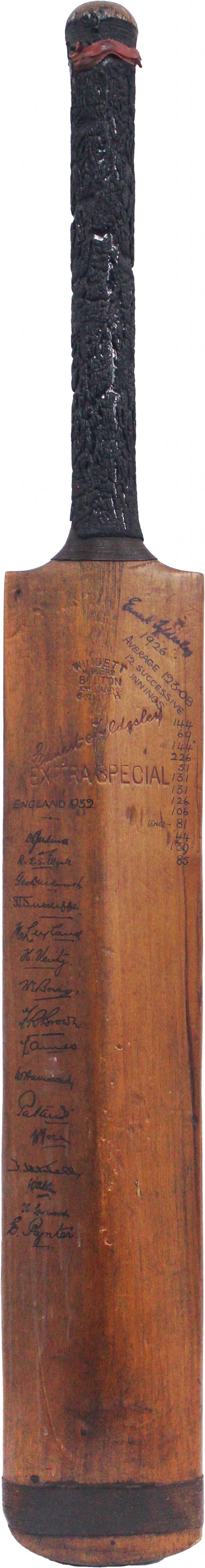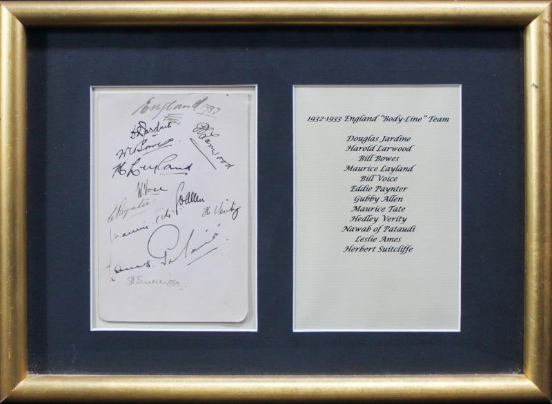 endorsed '1926, Average 123.08, 12 Successive Innings - 144, 69, 144*, 226, 51, 131, 131, 126, 106, (Eng) 81, 44, 139, 85'. It was later signed by the 1932 England Body-Line Team - 16 signatures including Douglas Jardine, Wally Hammond & Harold
