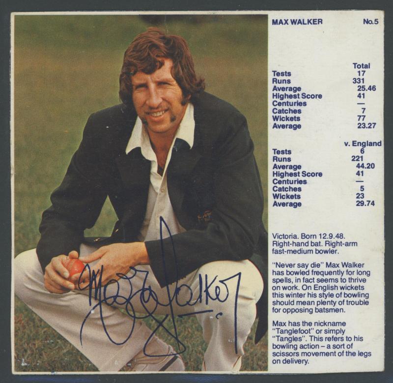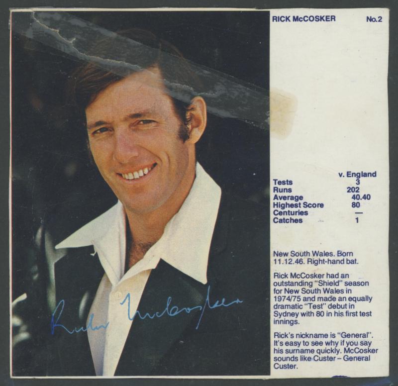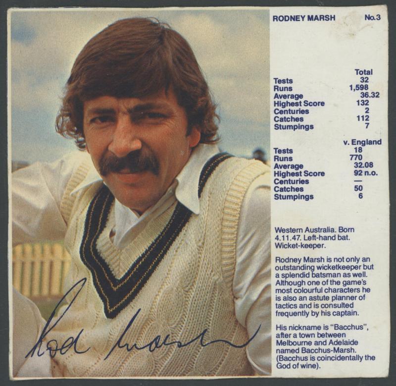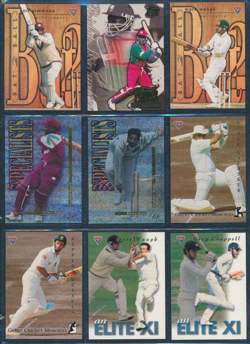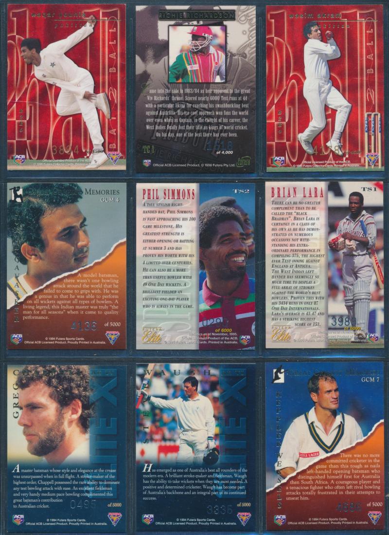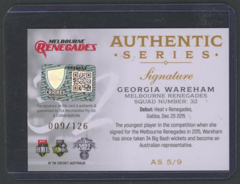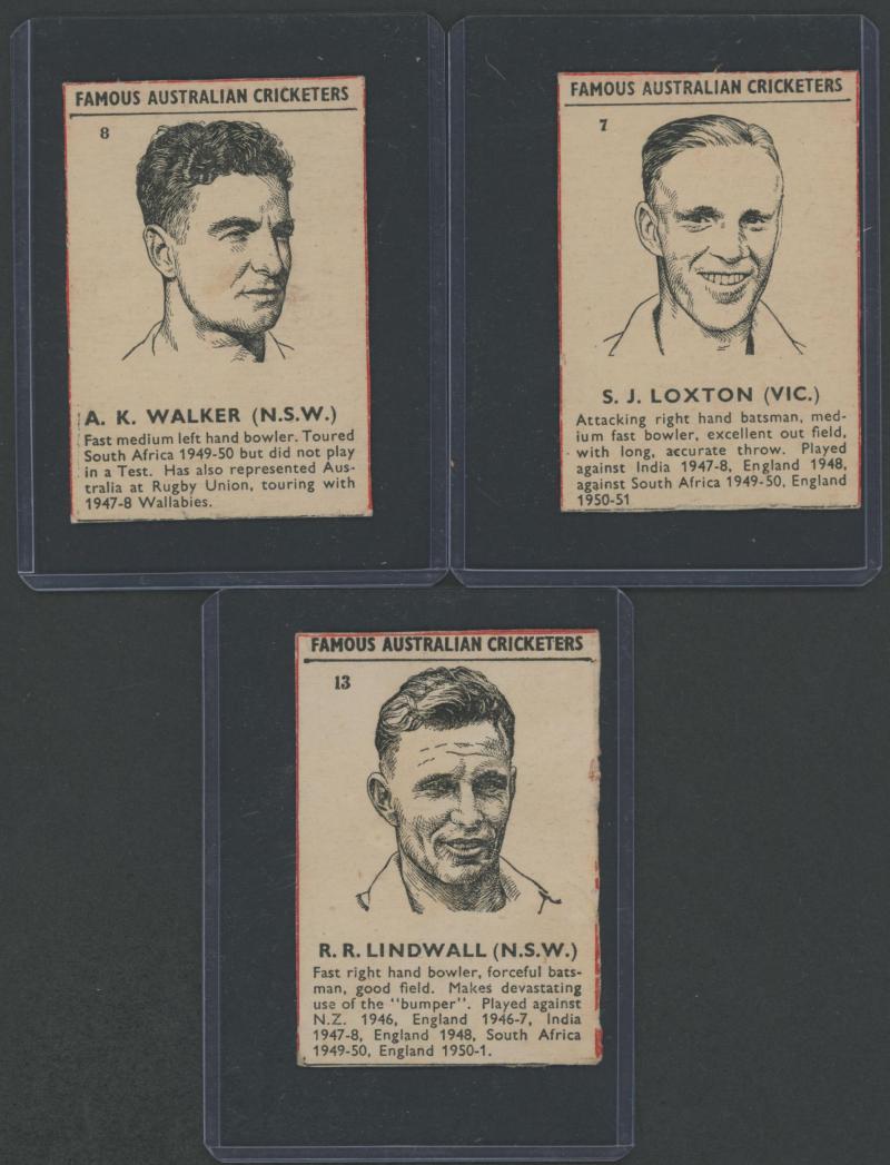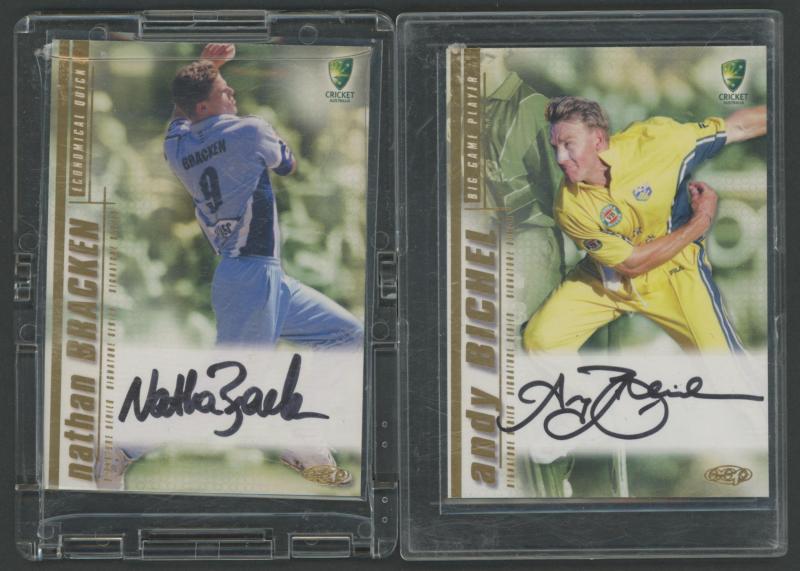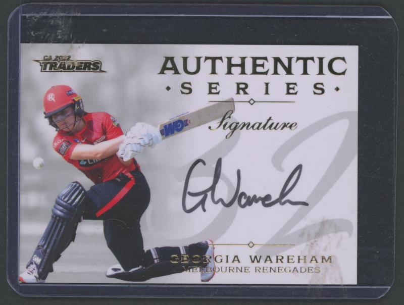 'Cricketers' [1/18]; 1955 Lifebuoy Soap 'Cricketers' [3/18]; 1974 Ajax 'Australian Cricketers' [8/11] (one with tape repair); 2003 Elite Sport 'Signature Cards' - Andy Bichel & Nathan Bracken; 2022 'Georgia Wareham Signature Card' number 009 of 126,