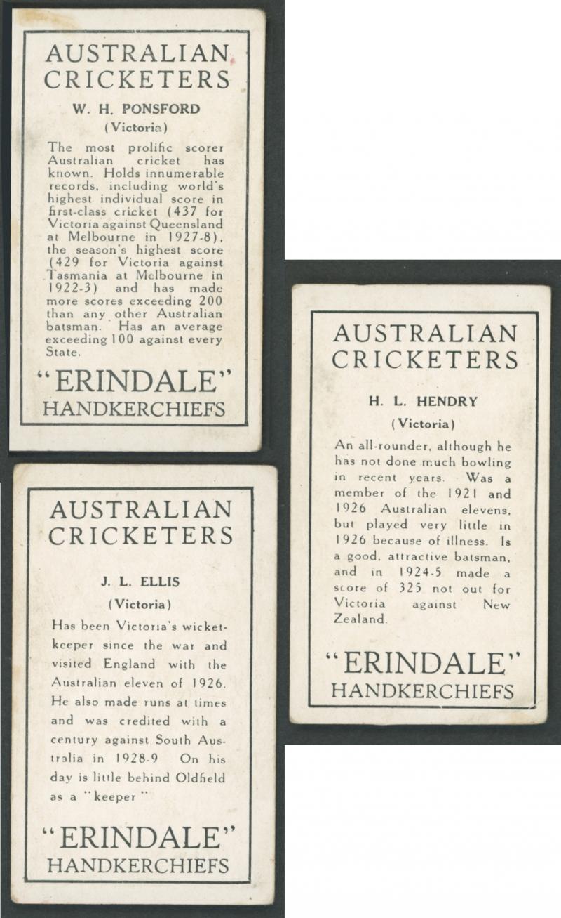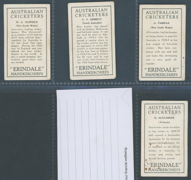 Collection of better cricket cards comprising 1930 Erindale Handkerchiefs 'Australian Cricketers' [7/18]; 1938 Boys Captain