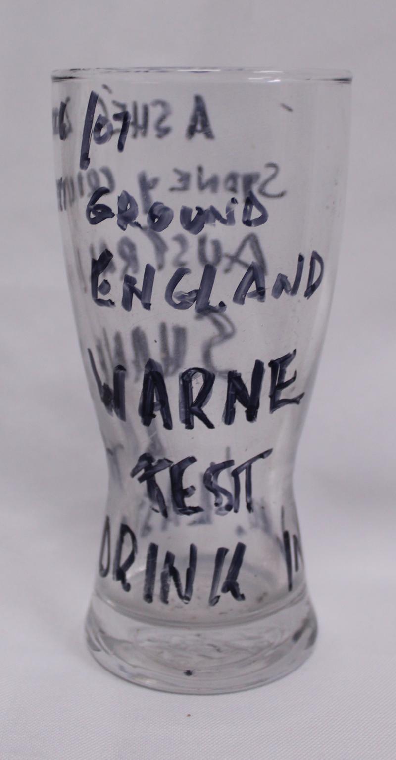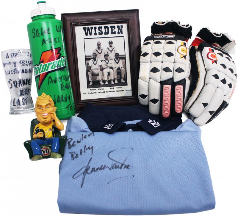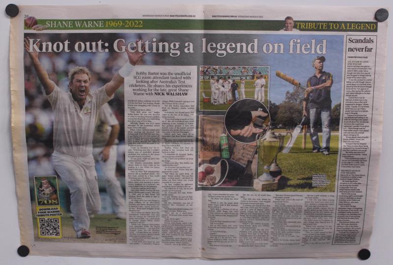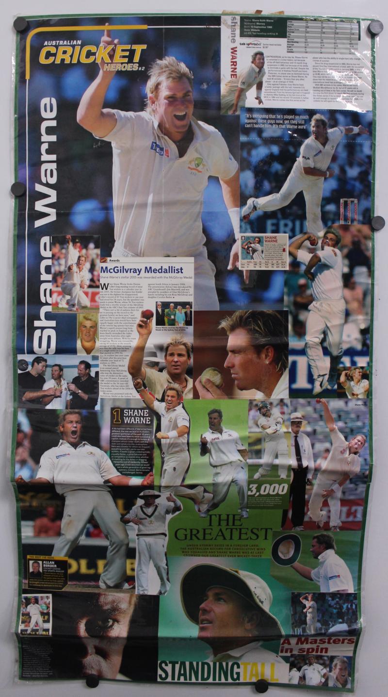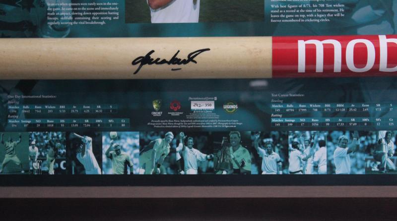"SKW" used in Shane's last SCG Test; small drinking glass Shane used in the sheds for his 'Ice & Coca-Cola' refresher; two large photo assemblages adorning the walls next to his SCG locker space; other sundries including VB 'Warnie' figurine. Ex SCG