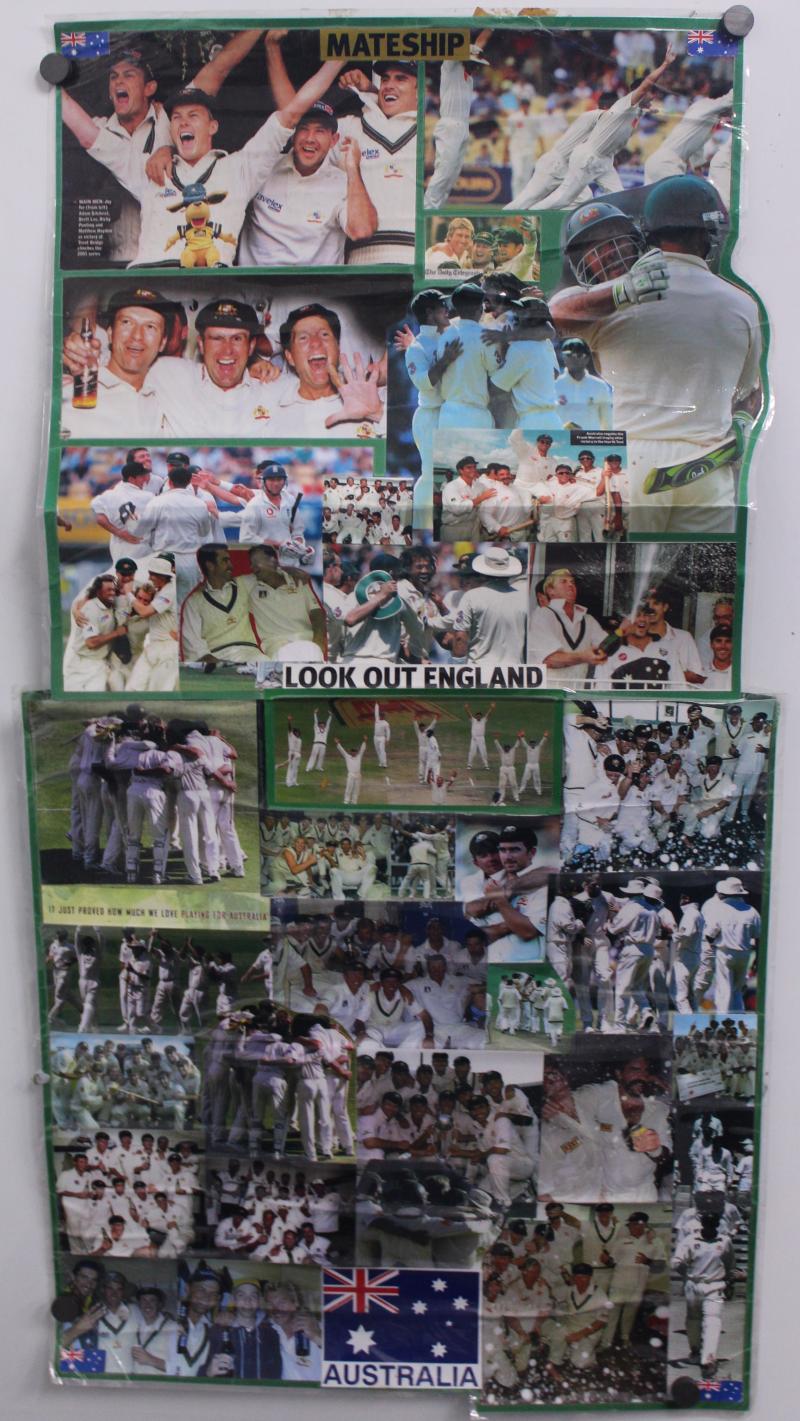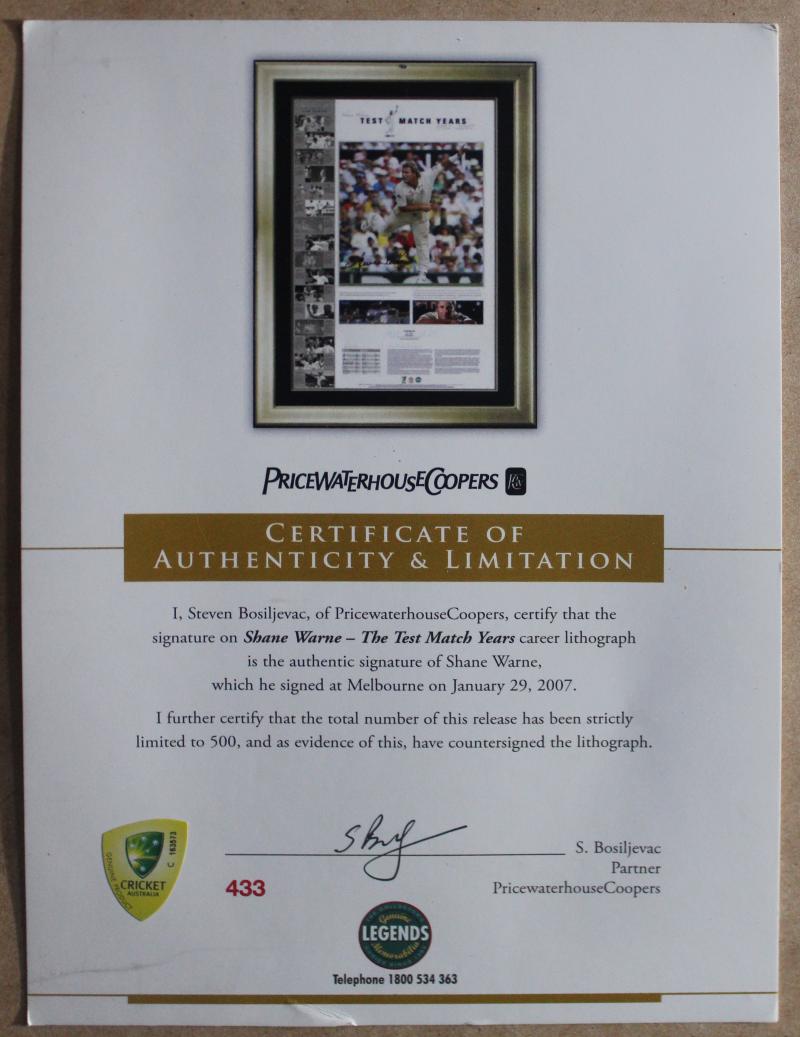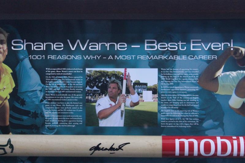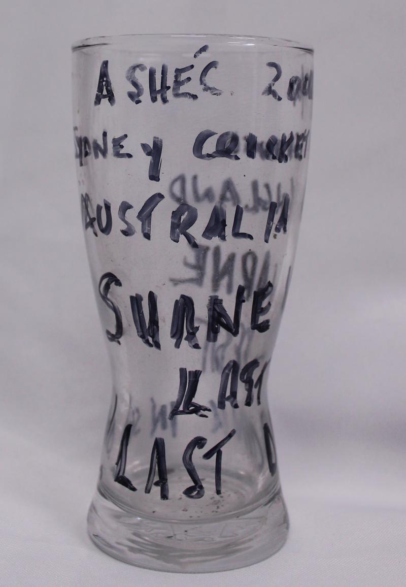 "SKW" used in Shane's last SCG Test; small drinking glass Shane used in the sheds for his 'Ice & Coca-Cola' refresher; two large photo assemblages adorning the walls next to his SCG locker space; other sundries including VB 'Warnie' figurine. Ex SCG