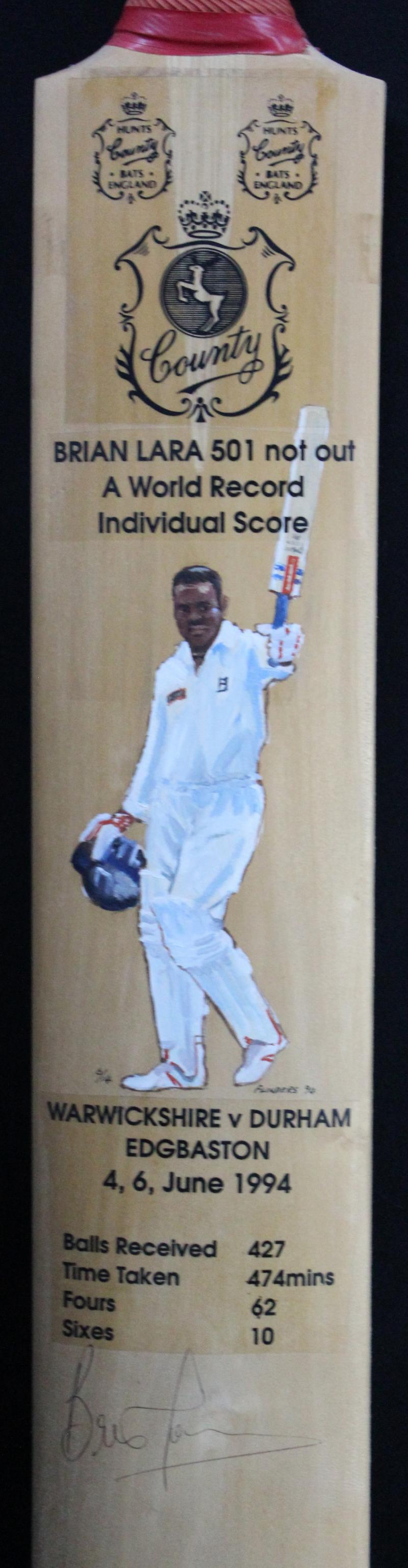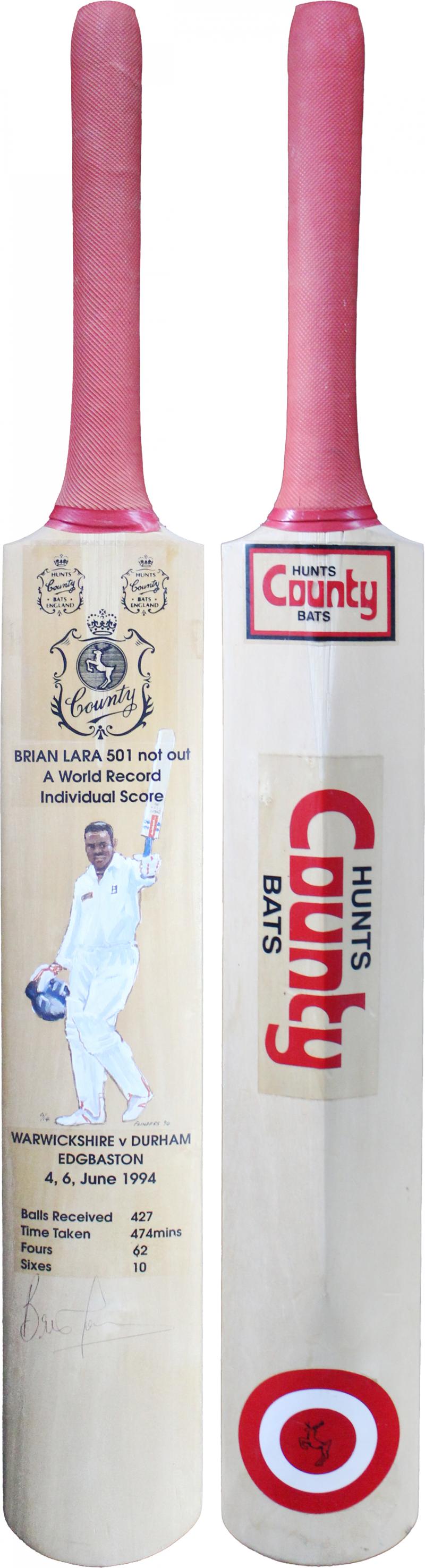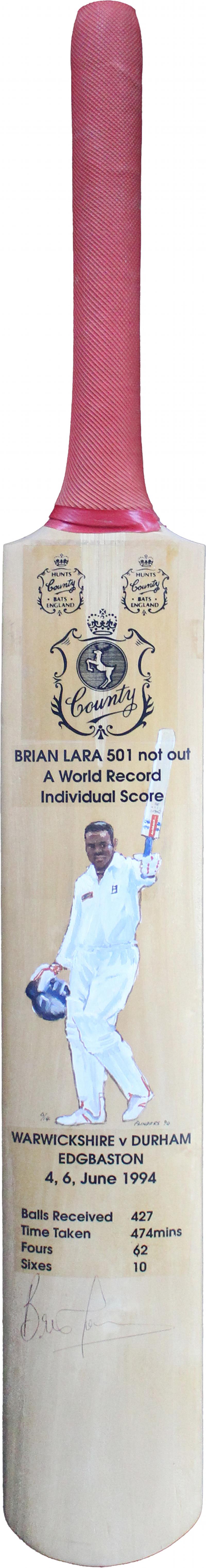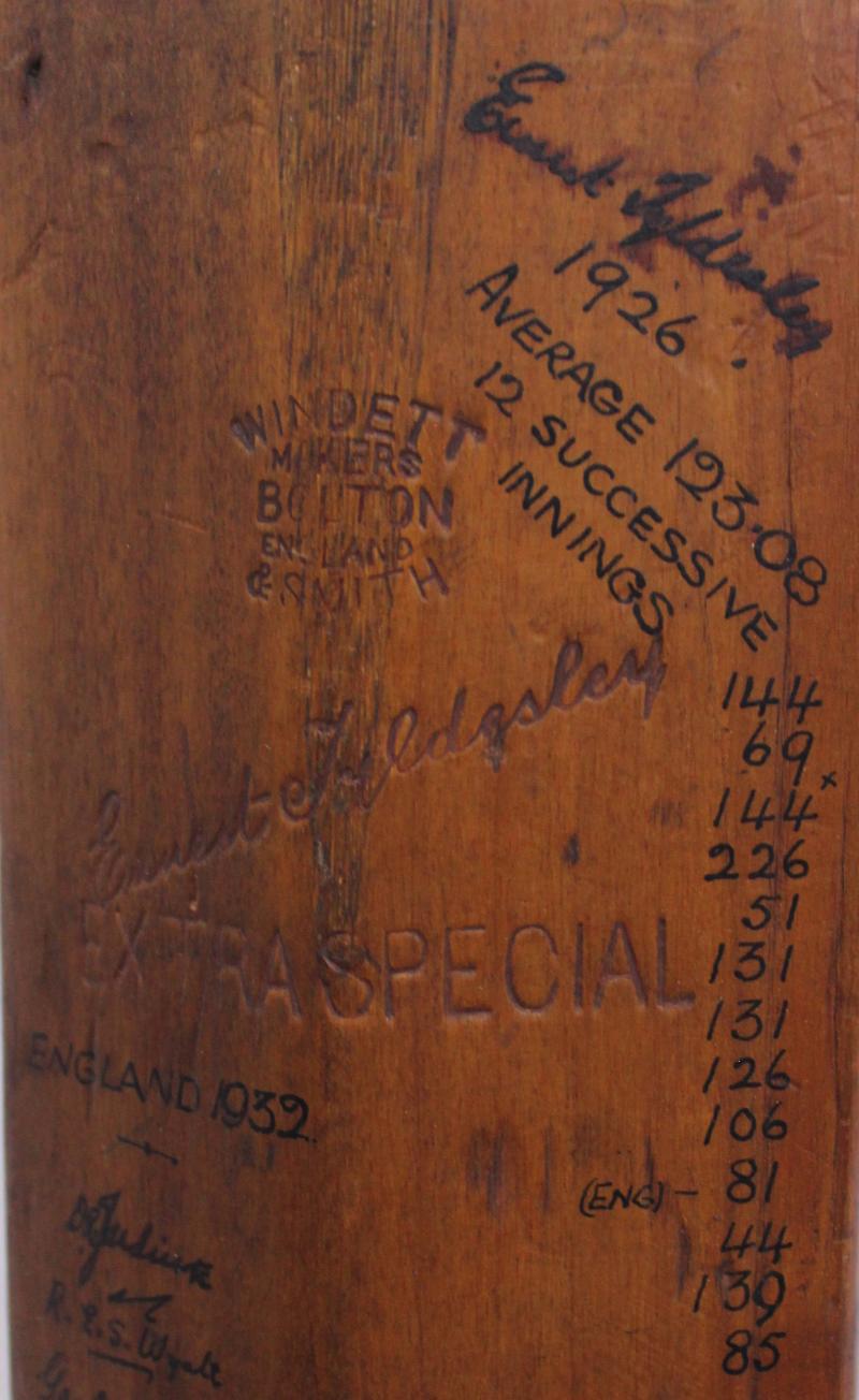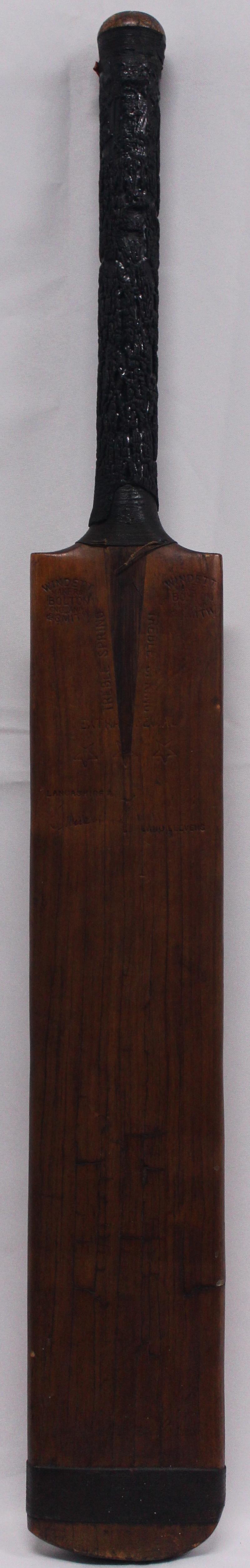 Larwood. The bat was reinforced with twine at base, and shows results of its heavy usage. The signatures and endorsements on reverse have been improved for display purposes. Provenance:- Family of Ernest Tyldesley. [Ernest Tyldesley, remains