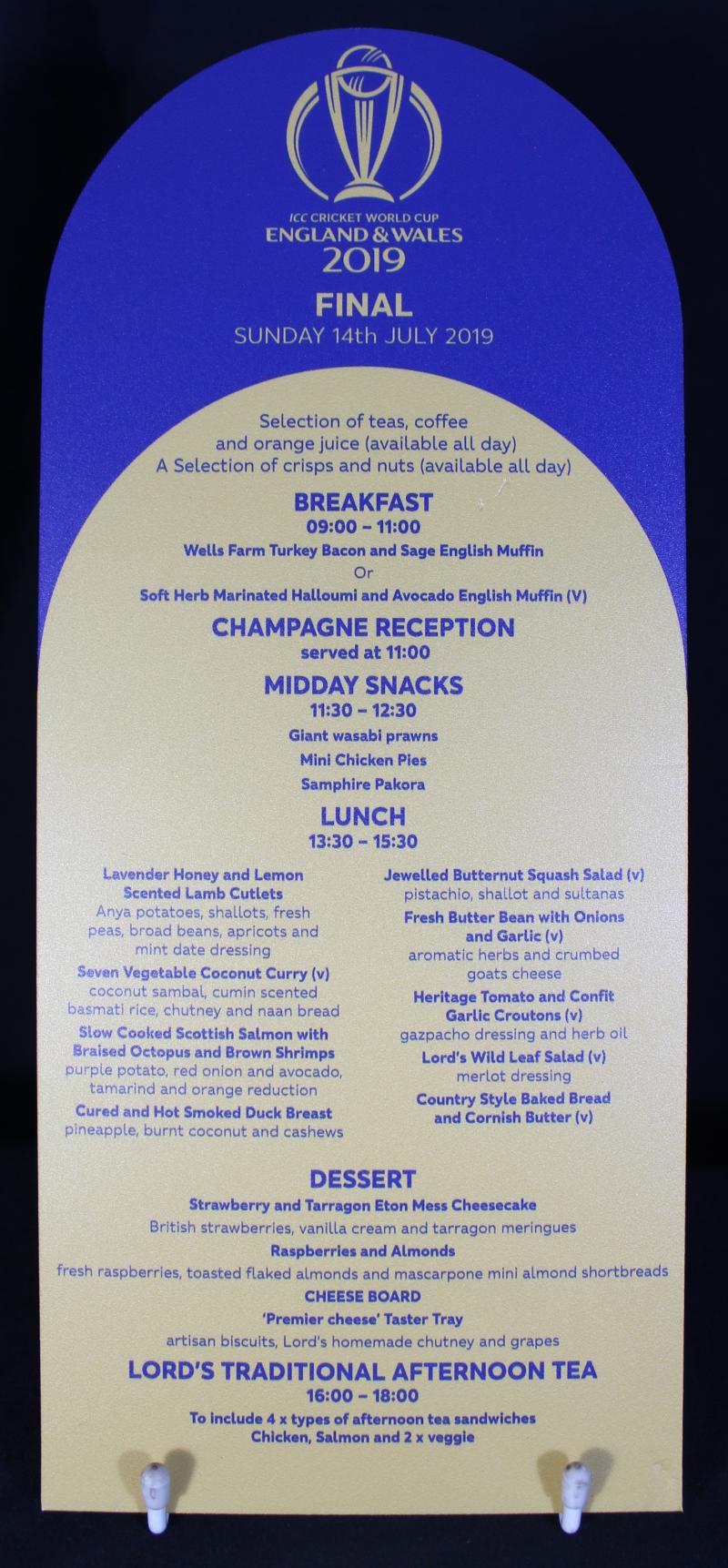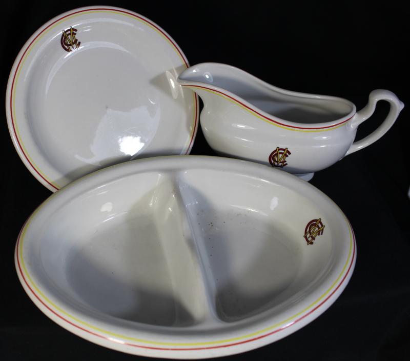 MCC Crockery plate, gravy boat & nuts plate, each made by Churchill with MCC (Lords) logo; plus a menu for the 2019 ICC World Cup
