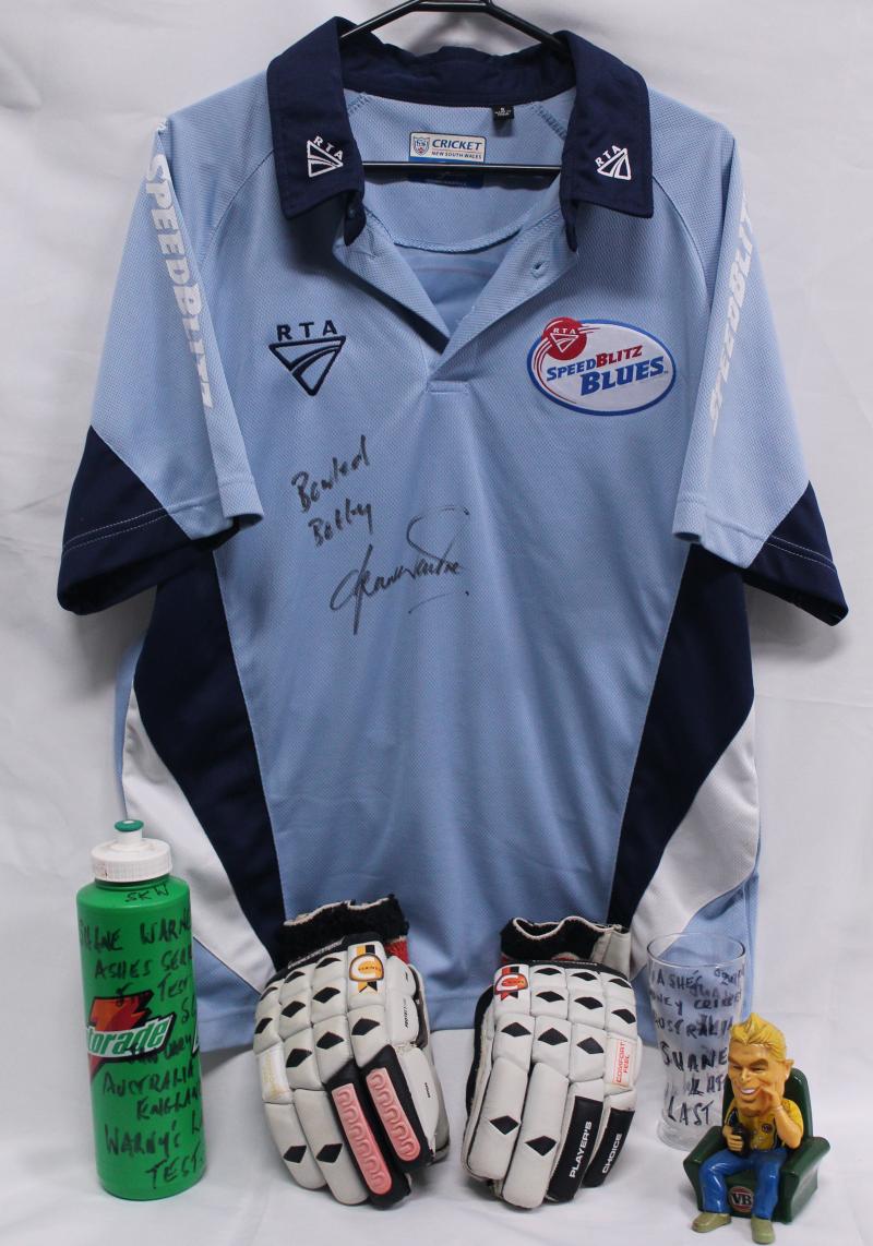SHANE WARNE: Group comprising signature on NSW Speedblitz Blues shirt; pair of batting gloves (unsigned); Gatorade drink bottle