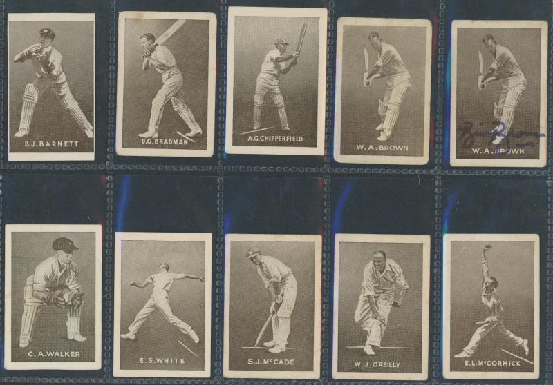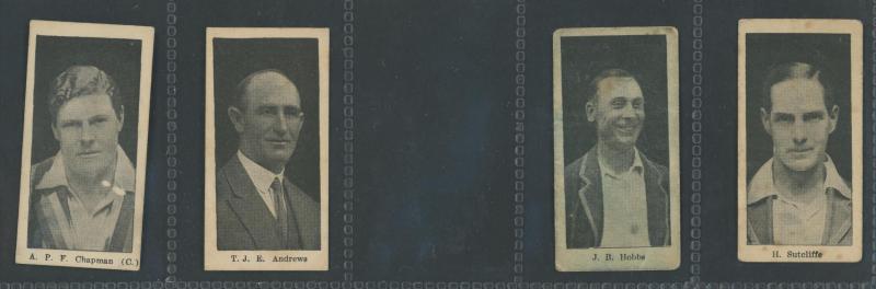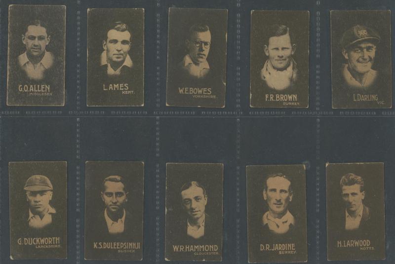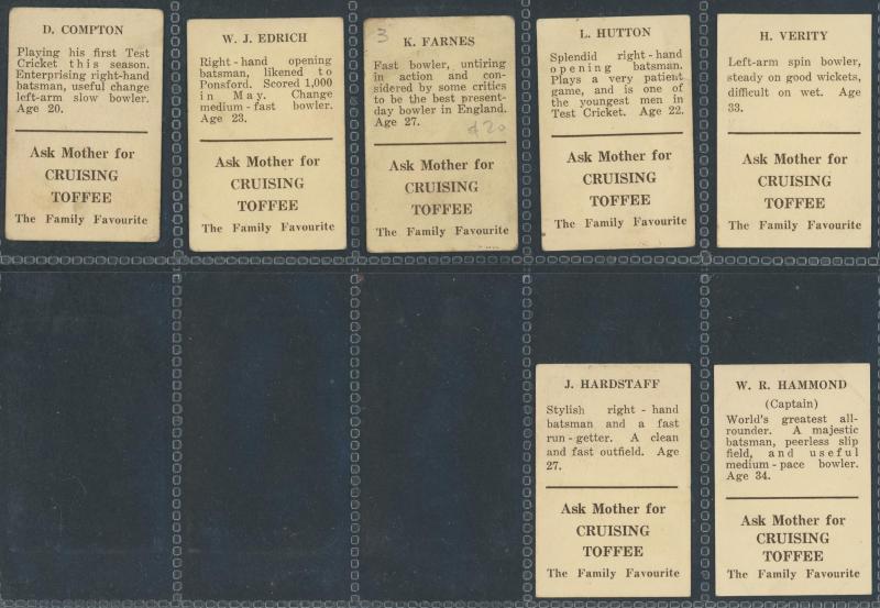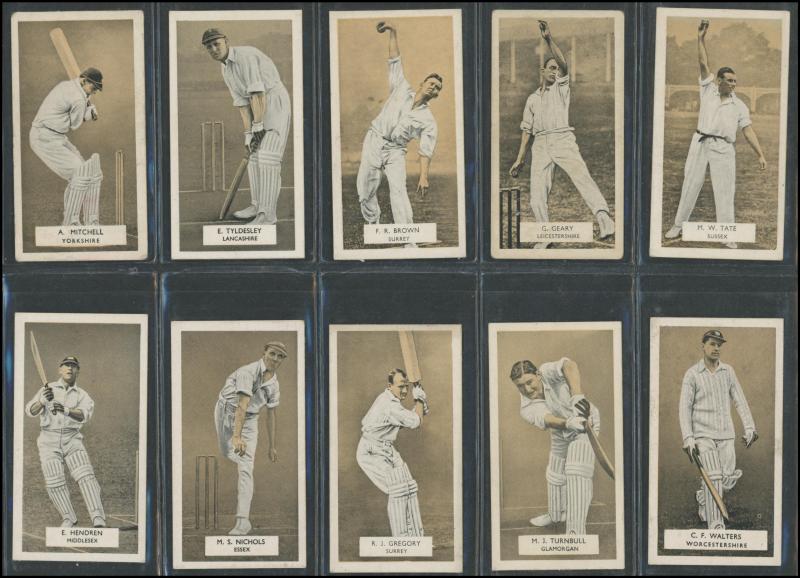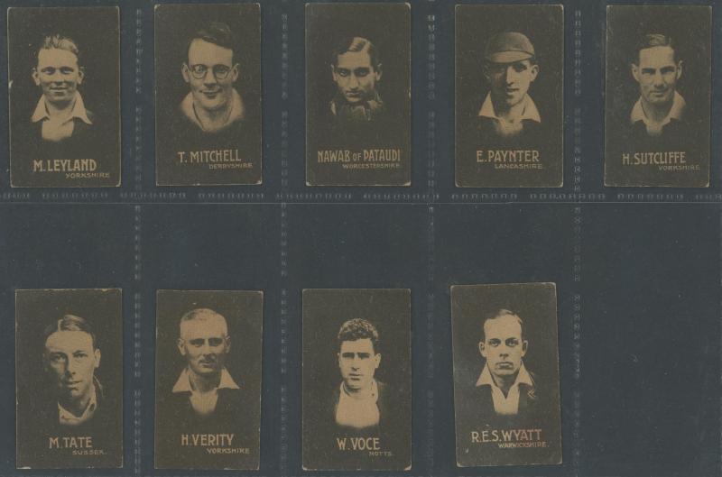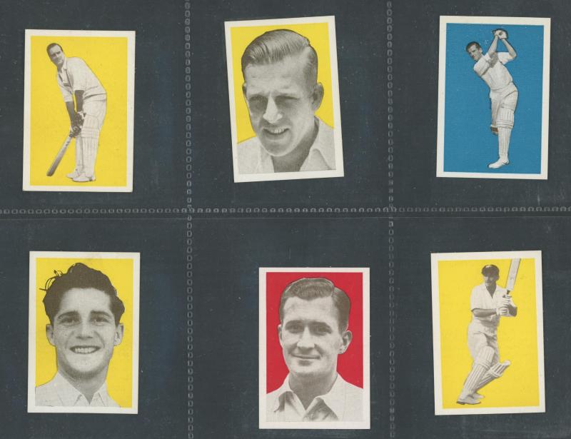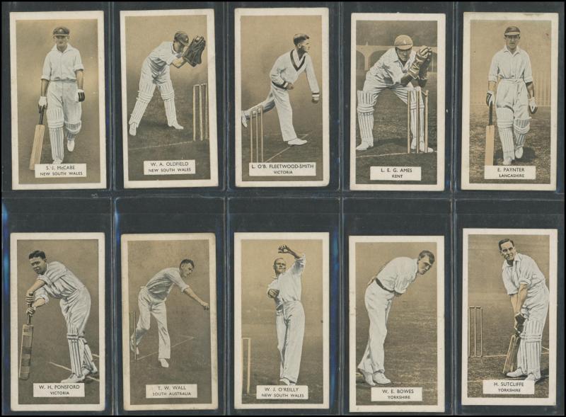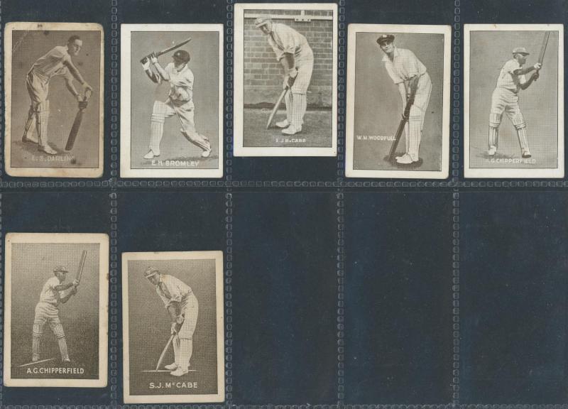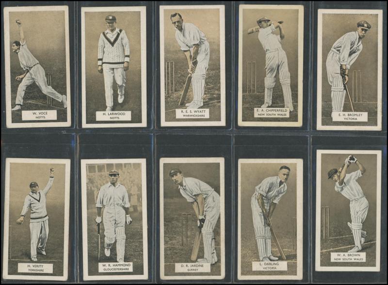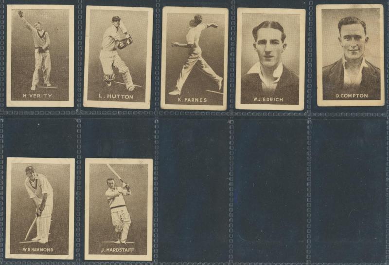 'Australian Cricketers' [11]; 1937 (Cruising Toffee) 'Australian Cricketers' [12 - one signed]; 1938 (Black Crow) 'English Cricketers' [6]; 1938 (Cruising Toffee) 'English Cricketers' [7], mainly Fair/Very Fine condition. Rare.