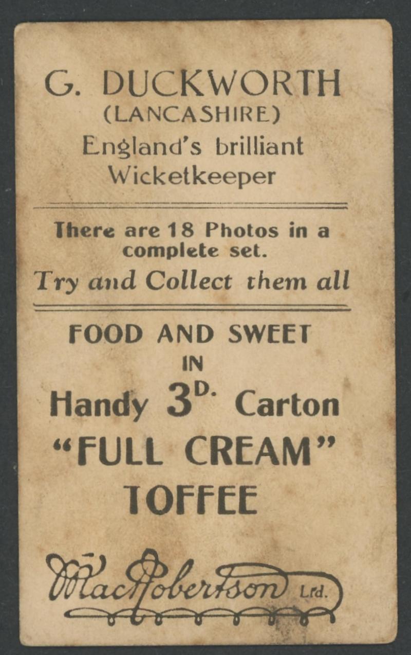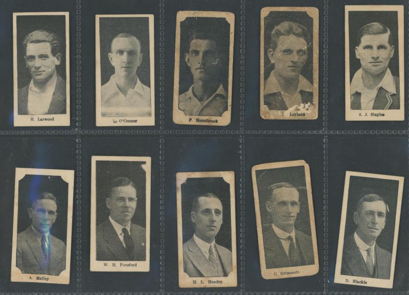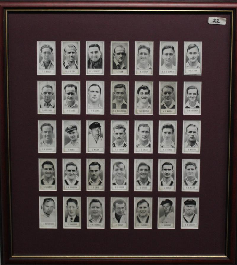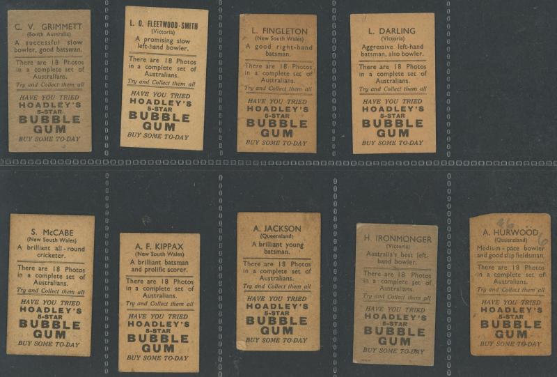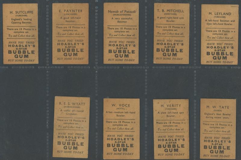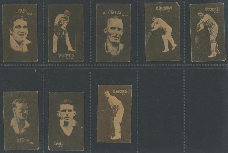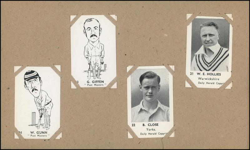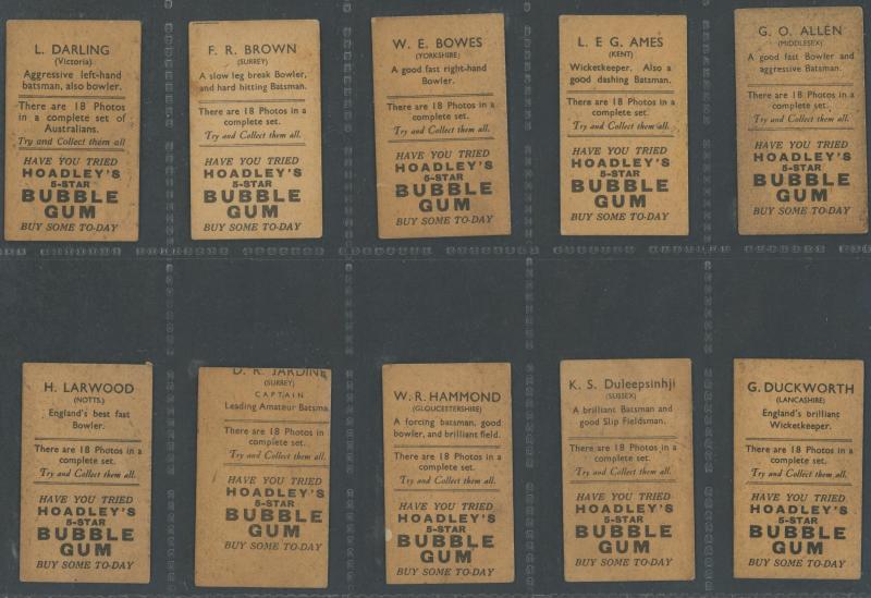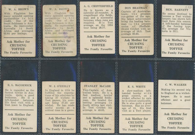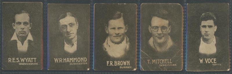 'Australian Cricketers' [11]; 1937 (Cruising Toffee) 'Australian Cricketers' [12 - one signed]; 1938 (Black Crow) 'English Cricketers' [6]; 1938 (Cruising Toffee) 'English Cricketers' [7], mainly Fair/Very Fine condition. Rare.
