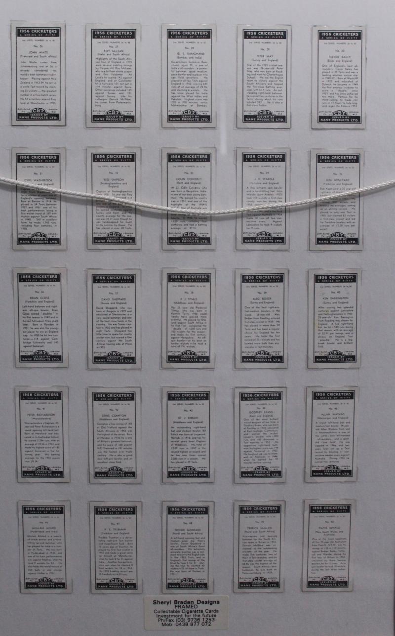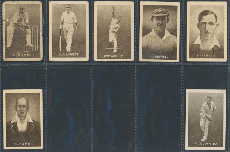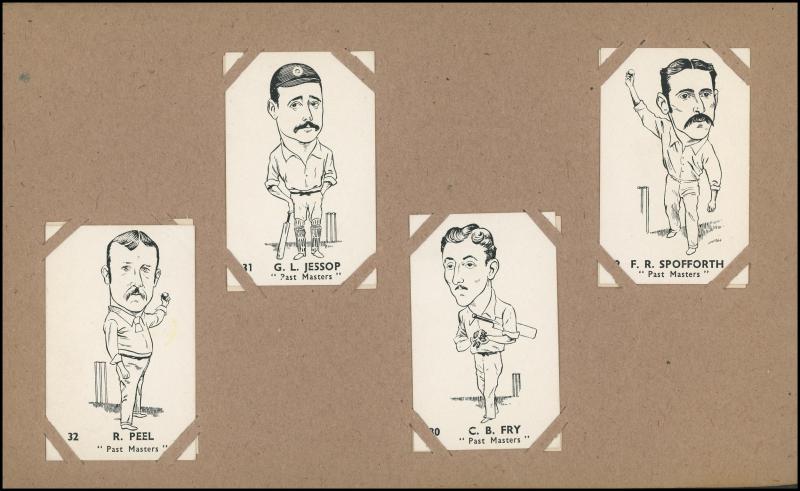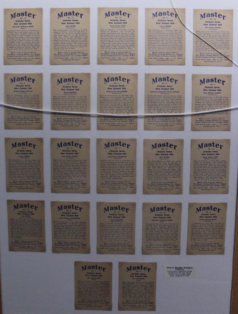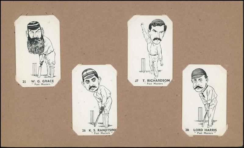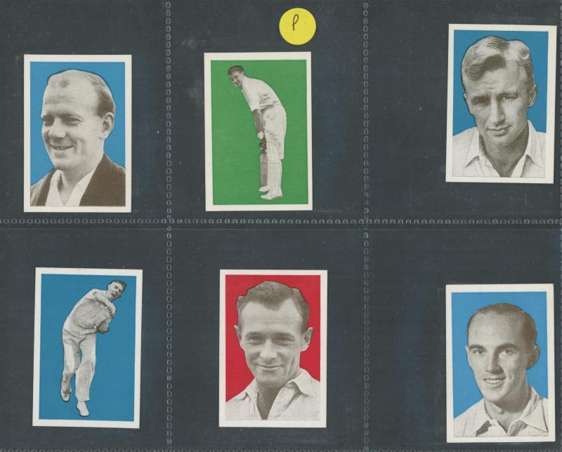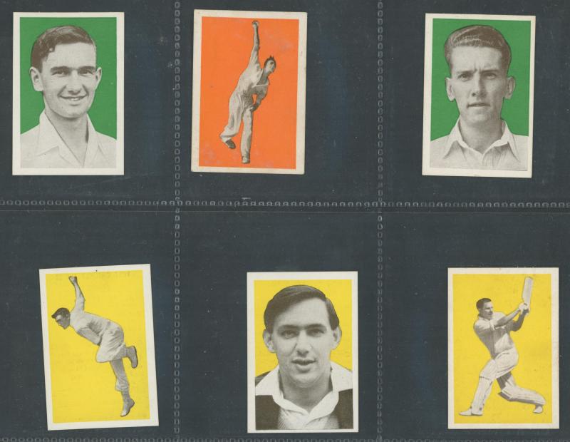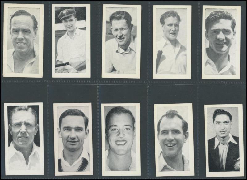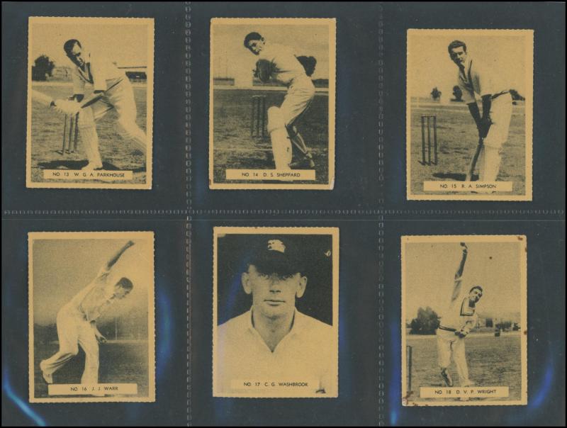 Cricketers' [50]; 1936 Churchman 'Cricketers' [50]; Master Vending Machine 'Cricketer Series, New Zealand 1958' [16]; Barratt & Co 'Test Cricketers' [35]; Kane Products '1956 Cricketers' 1st Series [25], 2nd Series [25] & 'Cricket Clubs & Badges'