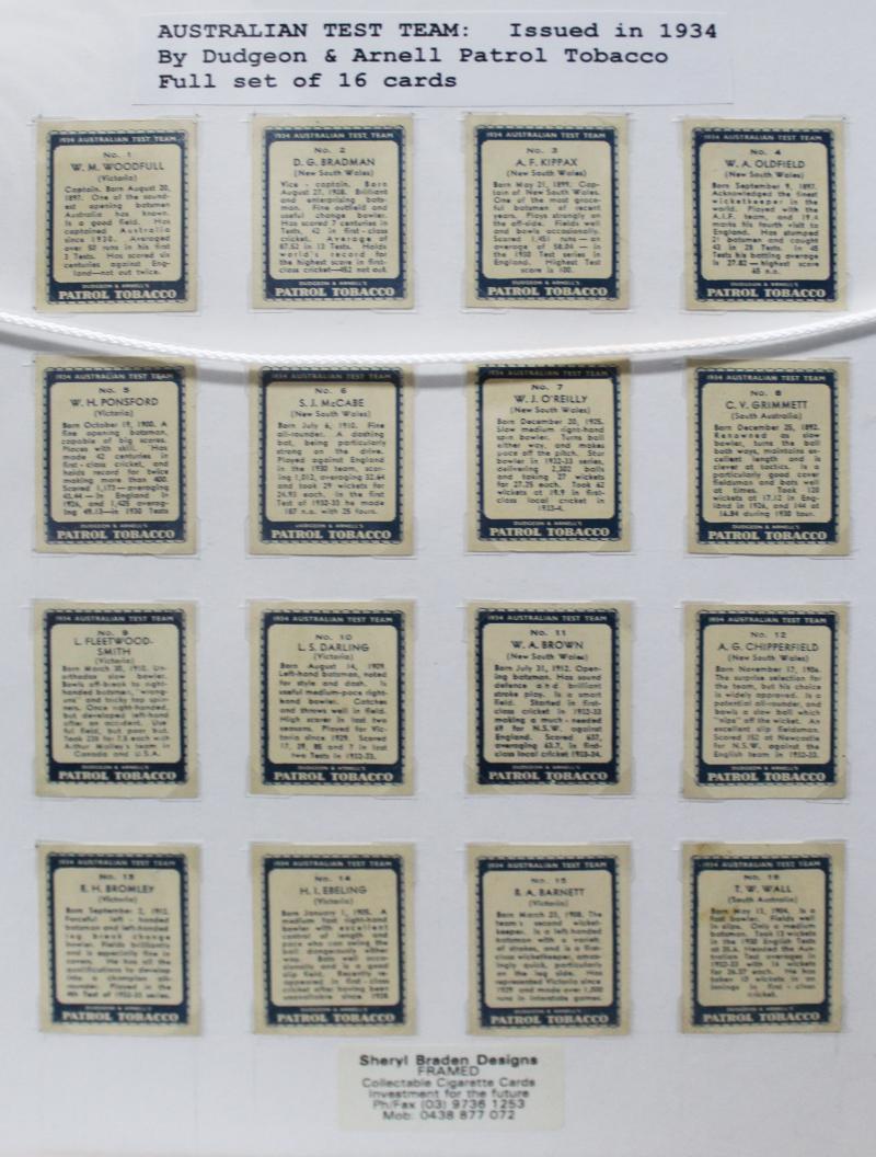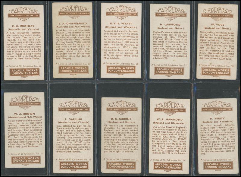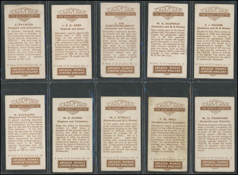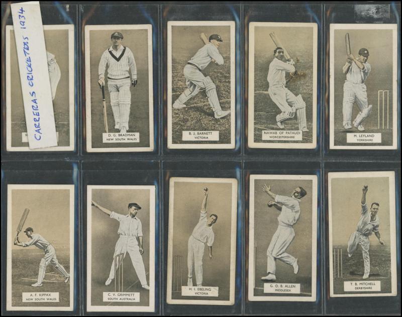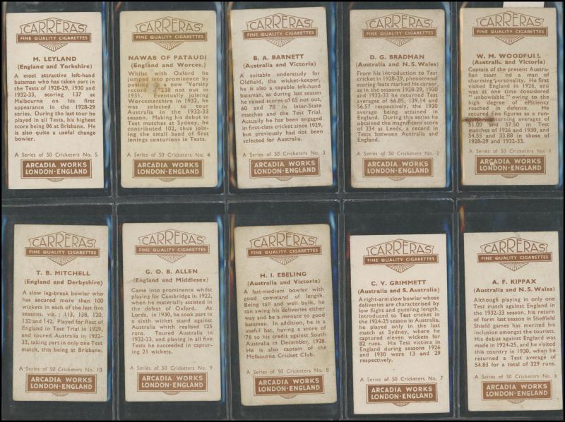 1934 cricket sets comprising Carreras 'A Series of 50 Famous Cricketers' [50]; Dudgeon & Arnell (Patrol Tobacco) '1934 Australian