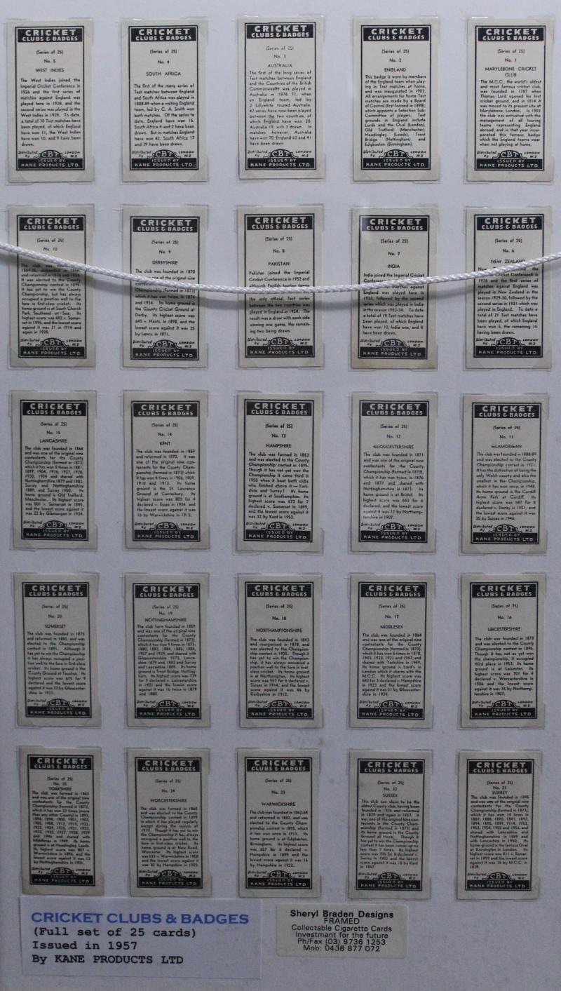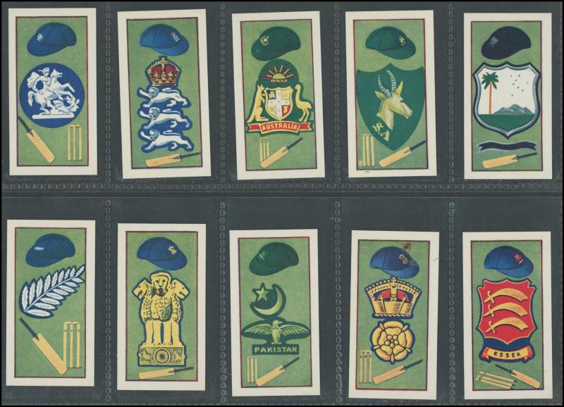 '1956 Cricketers' 1st Series [25] & 2nd Series [25]; 1957 Kane Products 'cricket Clubs & Badges' [25]; 1951 Potter & Moore 'Australian Cricketers' [7/20] & 'English Cricketers' [19/20], mainly Fine/Very Fine.