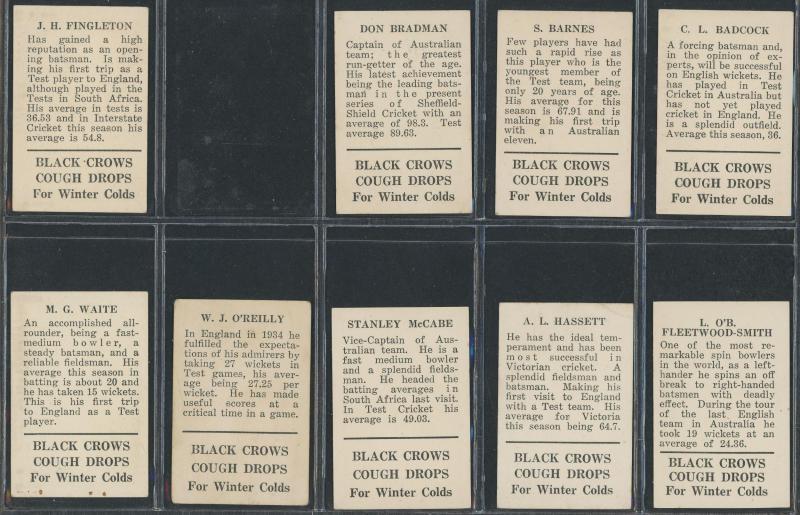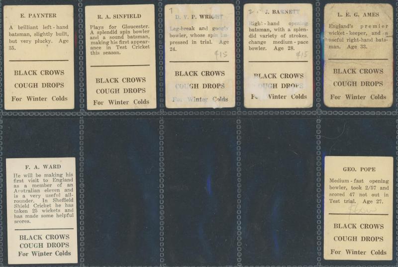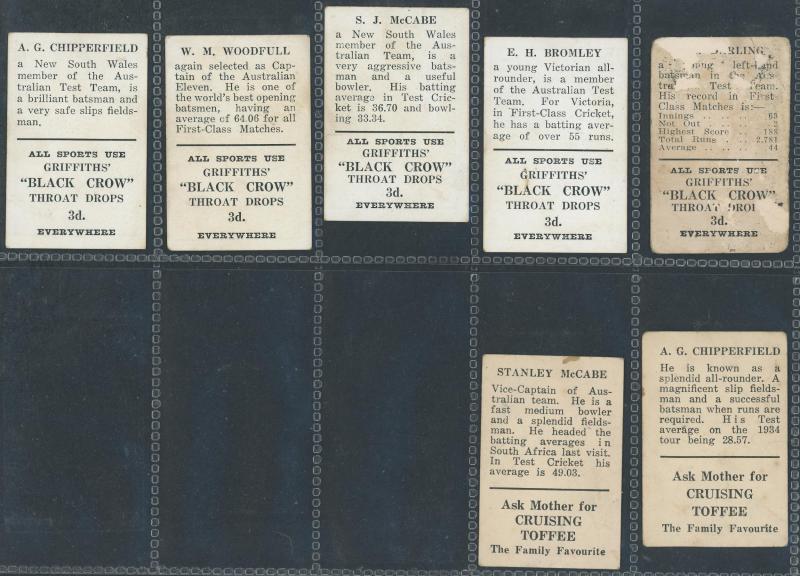 1936-38 Griffiths Brothers range comprising 1936 (Black Crow Cough Drops 3d) 'Australian Cricketers' [5]; 1937 (Black Crow)