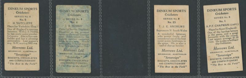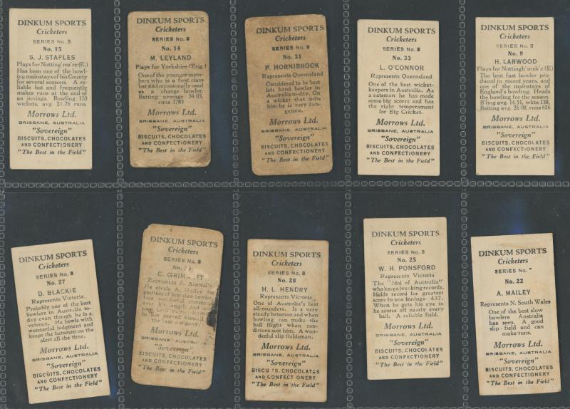 1930-31 Morrows Biscuits & Confectionary 'Dinkum Sports - Series No.3 Cricketers' part set [15/42], mainly Fair/Fine. Very scarce