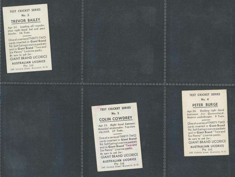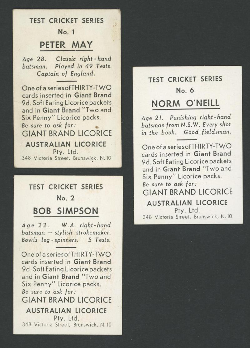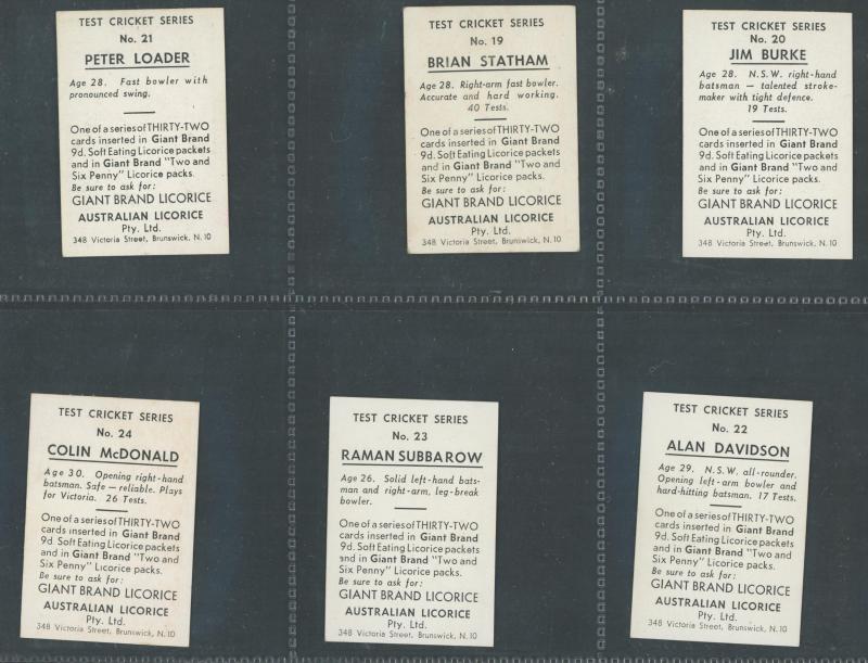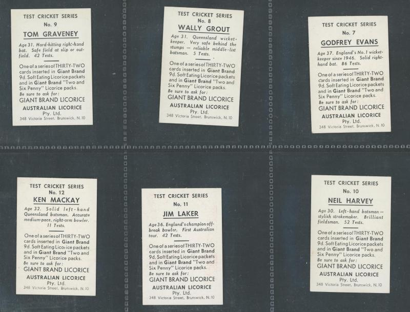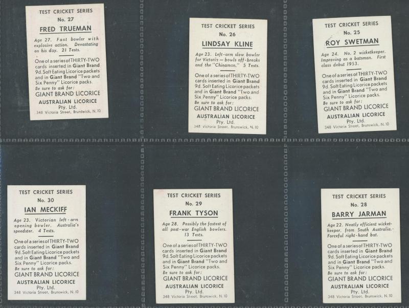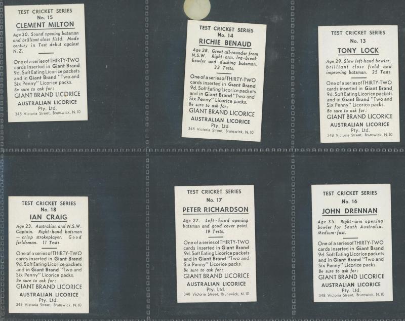 1958 Australian (Giant Brand) Licorice 'Test Cricket Series' in Blue [9/32], Green [4/32], Orange [6/32], Red [9/32] & Yellow