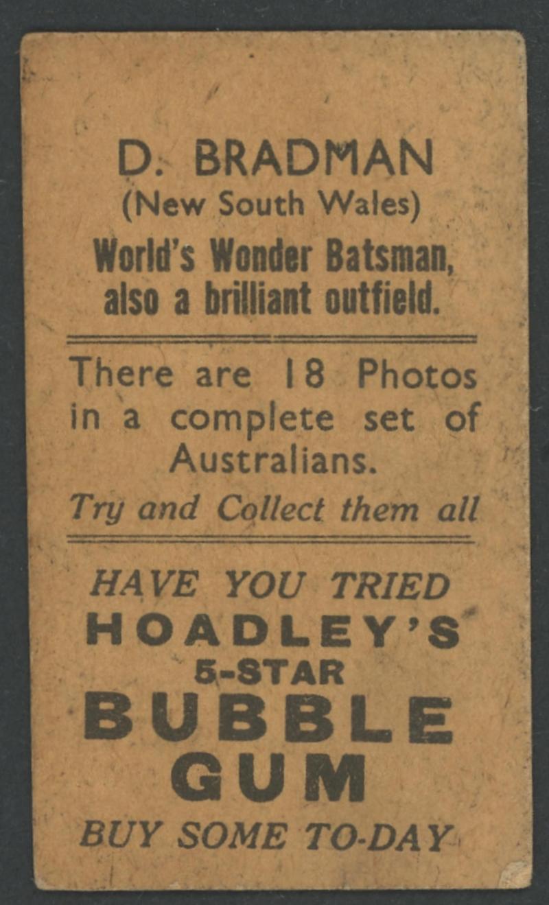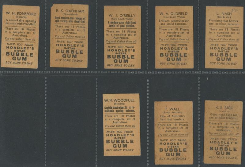Nash, Oldfield, Ponsford & Wall, on card (0.48mm thick), appear to have been cut from cereal packets, a few with minor faults, Fair/Fine. The Bradman card not recorded in 'Bradman Card Issues 1928-1970 A Collector's Guide' by Jodi Bridges.