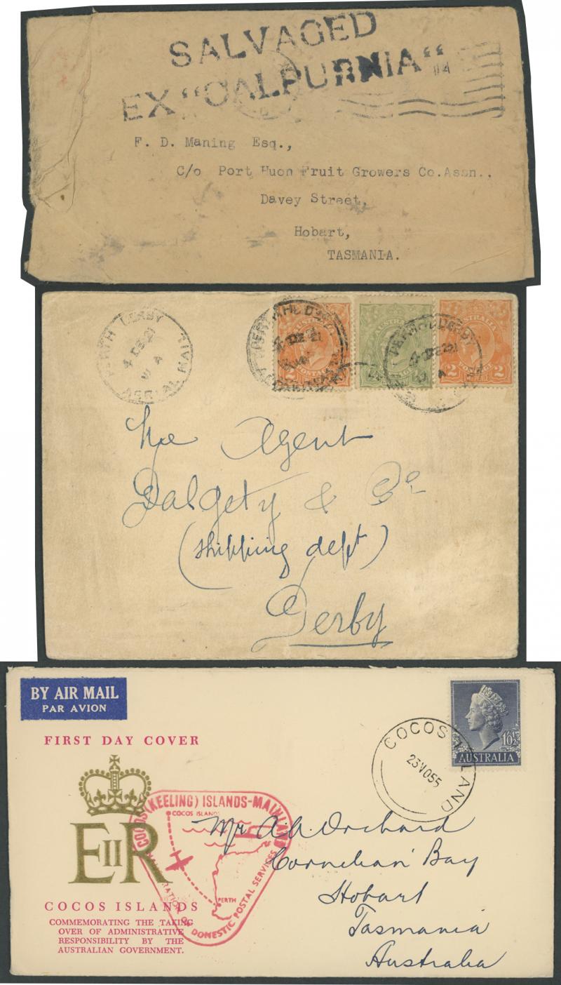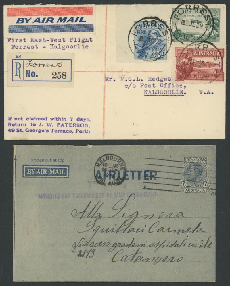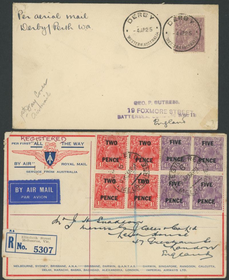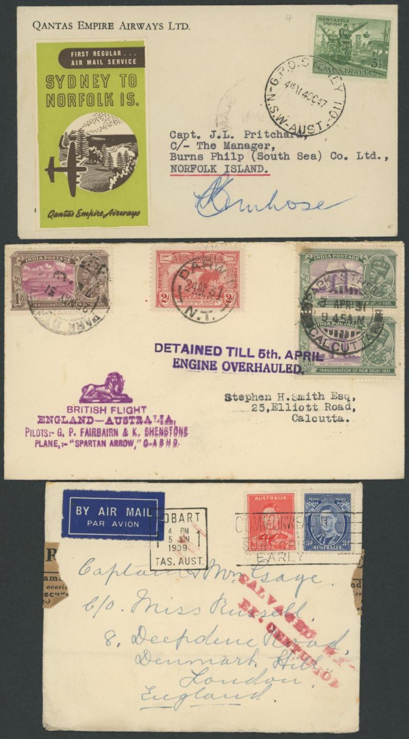 'PERTH DERBY/4DE21/ WA /AERIAL MAIL' cds, 1931 Fairbairn & Shenstone Calcutta-Darwin with superb '.../ENGINE OVERHAULED' cachet, 1947 Sydney-Norfolk Island with Qantas label & pilot-signed, 1955 Cocos Island flight with Map cachet in rosine, 1941