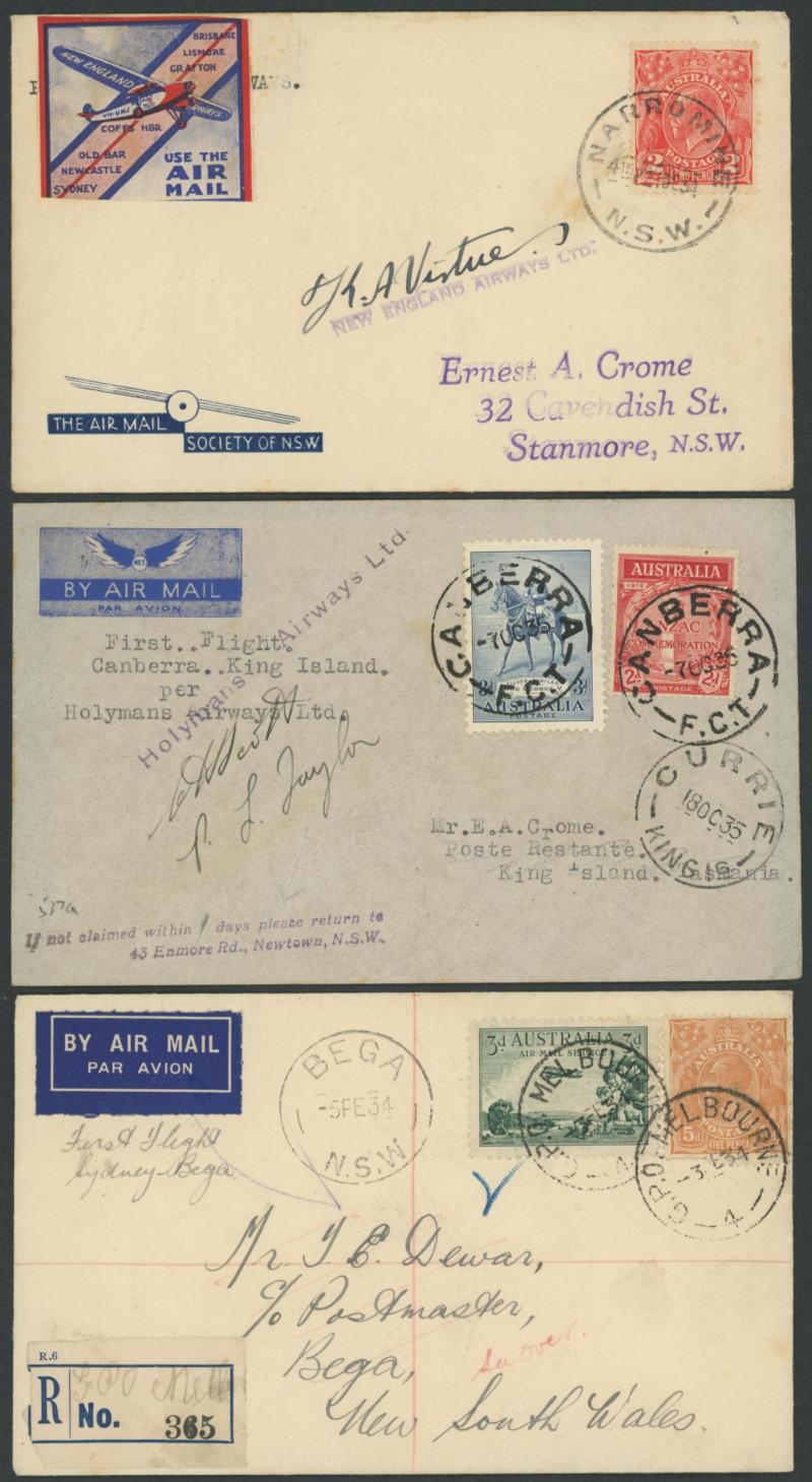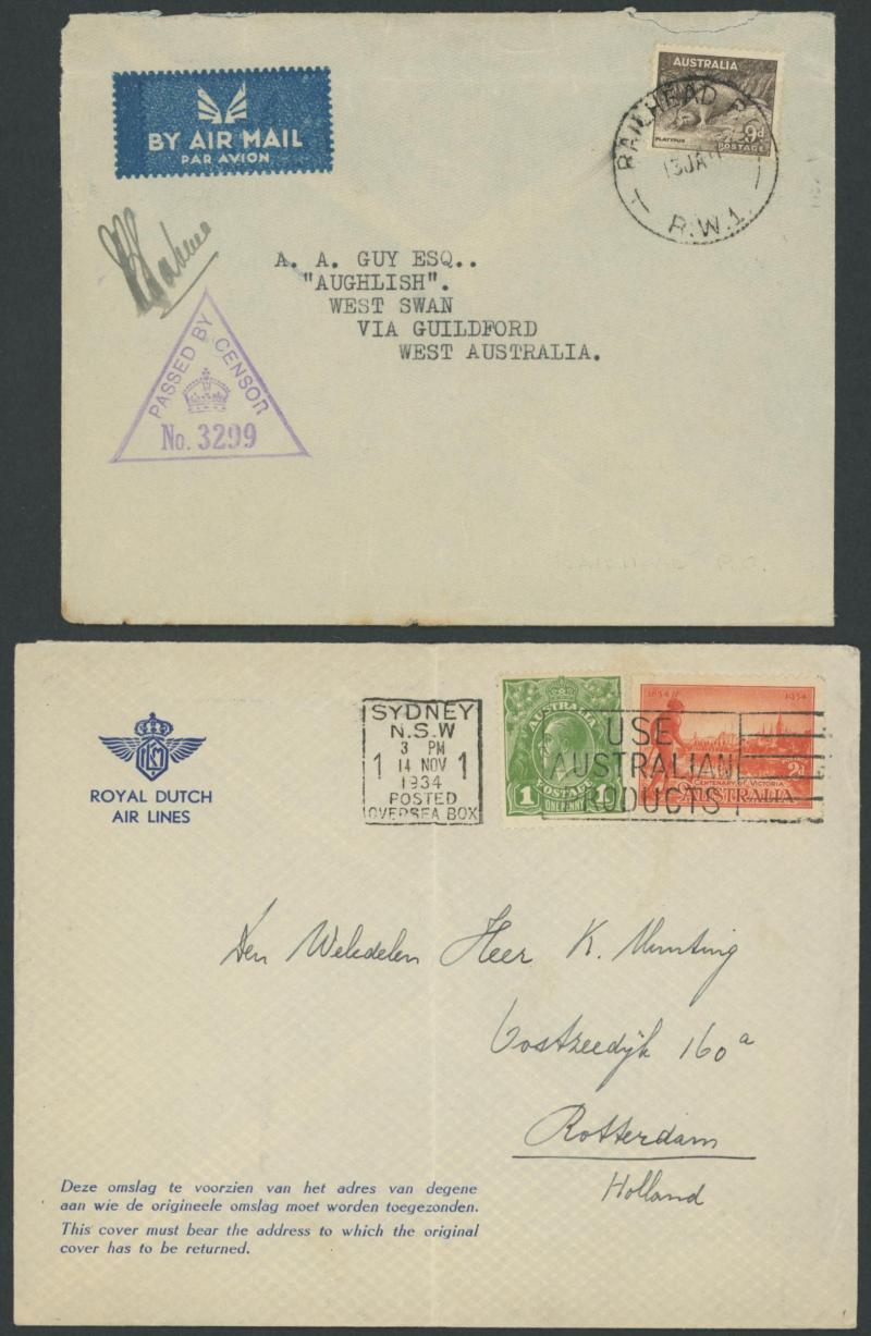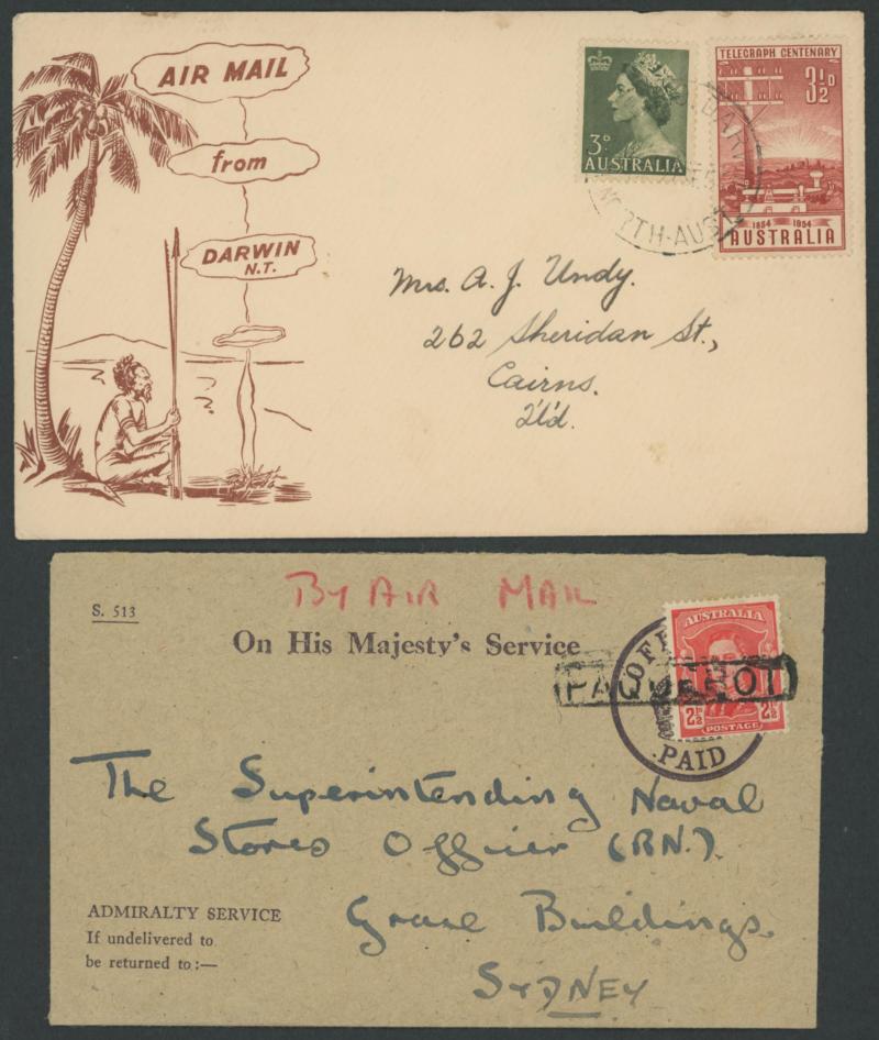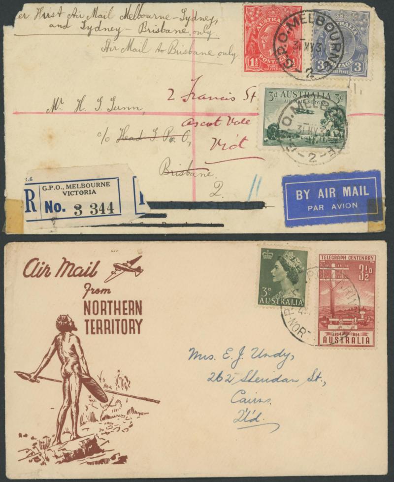 'PERTH DERBY/4DE21/ WA /AERIAL MAIL' cds, 1931 Fairbairn & Shenstone Calcutta-Darwin with superb '.../ENGINE OVERHAULED' cachet, 1947 Sydney-Norfolk Island with Qantas label & pilot-signed, 1955 Cocos Island flight with Map cachet in rosine, 1941