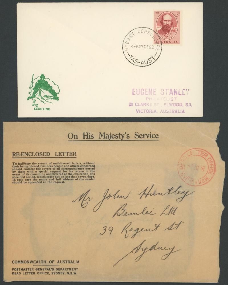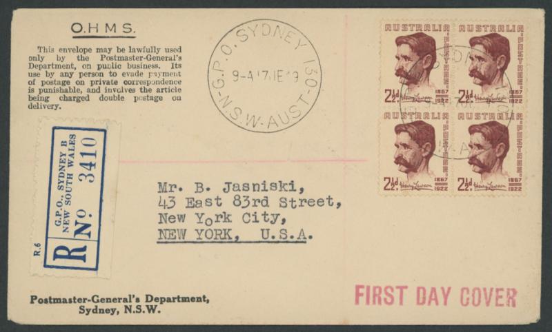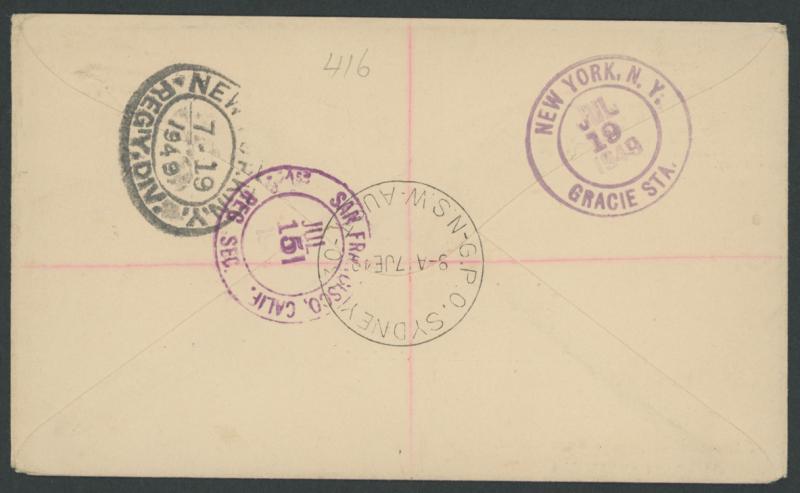 (registered to United States) or Tasmania Stamp Centenary 3½d pair tied by 'GPO SYDNEY 110' cds (Princess) or similar '...130' cds.