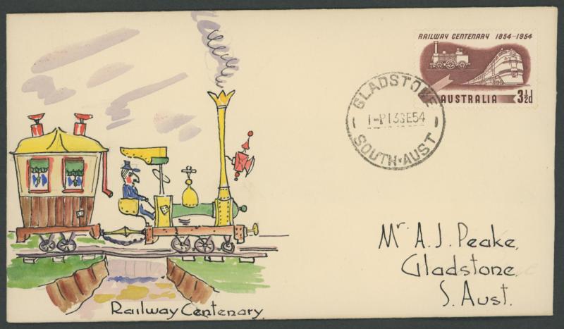 1954 Railway Centenary hand-illustrated FDC by Jack Peake with 3½d tied by 'GLADSTONE/I3SE54/ SOUTH-AUST' cds. Sold at our auction
