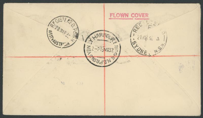 top of the sheets tied by '...NE PYLON/19MR32' cds, blue & black/white '.../NE PYLON' R label, 'FLOWN COVER' handstamp, Sydney transit & Perth arrival backstamps. 'Tillie Mitchell's superb example sold for $1770. (Image1) (Image2)