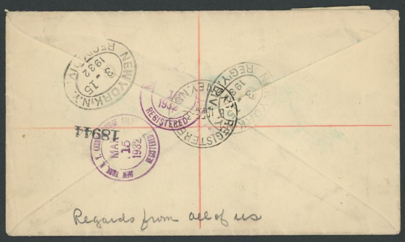 Day) in red with the boxed datestamp in green below, registered to Illinois USA with black & blue/white Exhibition R label, American 'REGISTERED' handstamp also ties the 5/-. Ex 'Tillie Mitchell': sold for $708 (Sale 242 Lot 437). (Image1) (Image2)