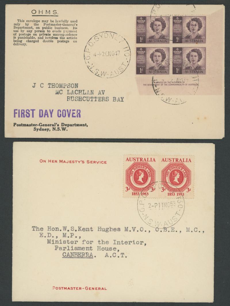 1947-53 OHMS covers each with Postmaster-General's imprint at lower-left with Princess 1d imprint block of 4, Lawson 2½d block of 4