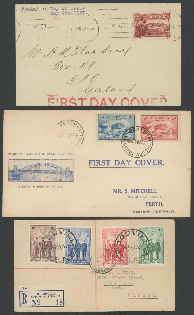 Handy Pre-Decimal group including 1927 Canberra (minor blemishes), 1932 Large Lyrebird 1/- (registered), 1932 Mitchell (Perth)