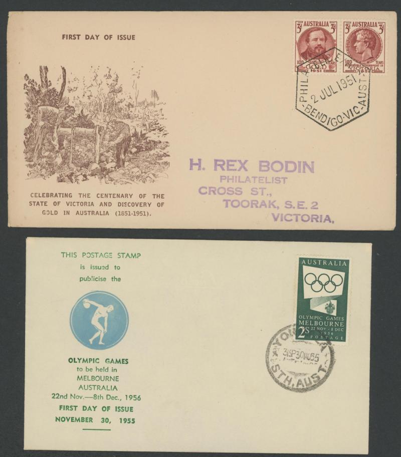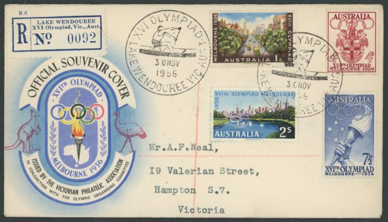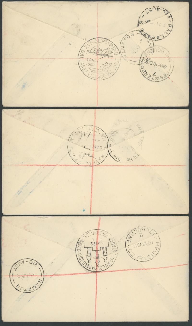 1956 Melbourne Olympics illustrated covers registered with blue/white R labels 'BALLARAT VILLAGE/XVI Olympiad, Vic., Aust', 'LAKE
