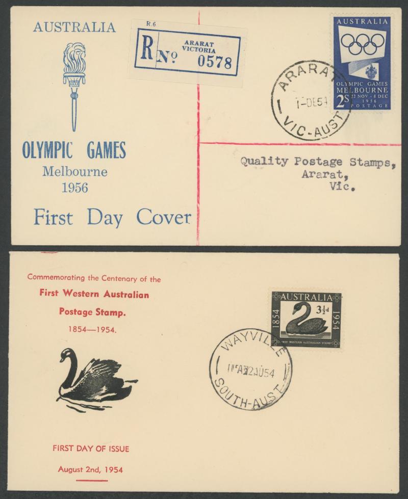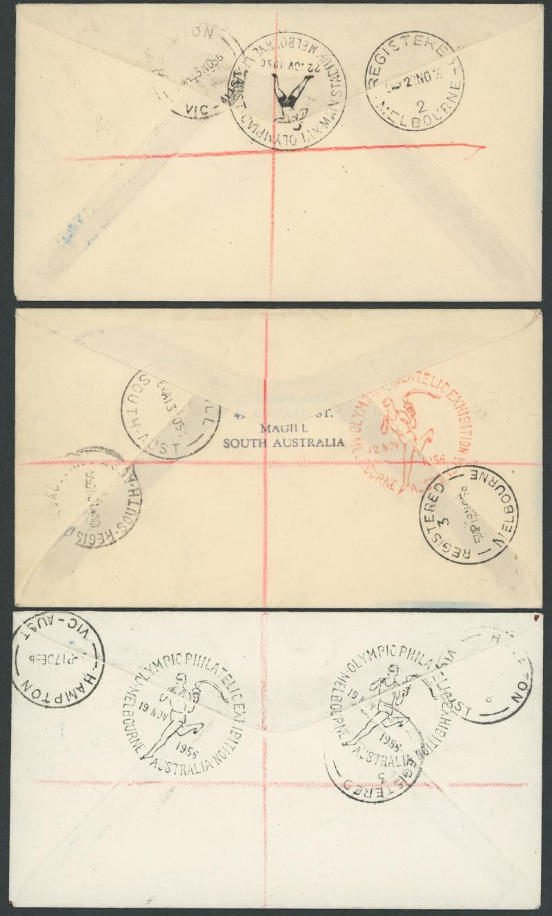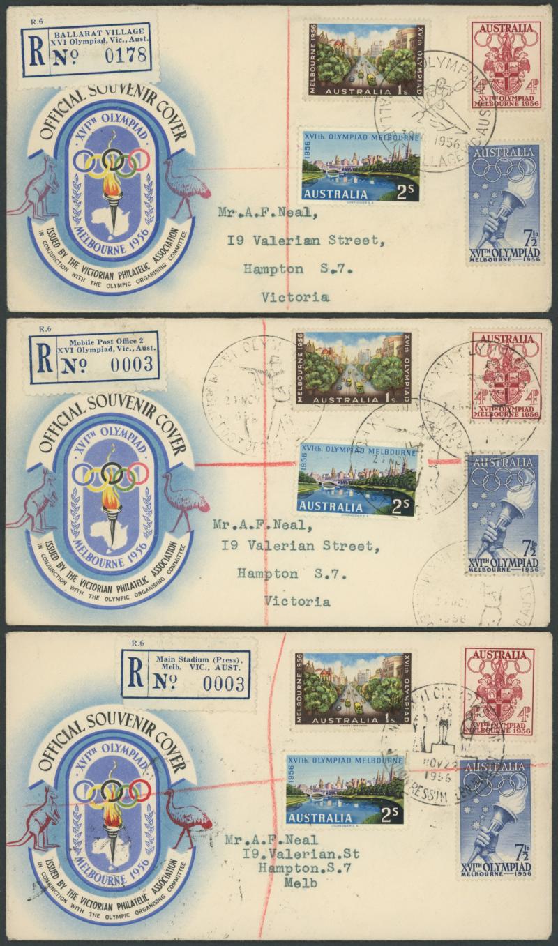 WENDOUREE/...', 'Mobile Post Office 2/...', 'Richmond Park Kiosk 1/...' and 'Main Stadium (Press)/Melb. VIC., AUST.' each with a complete set of 1956 Olympics tied by matching pictorial cds, also 'OLYMPEX/Melbourne Olympic/Philatelic Exhibition' red
