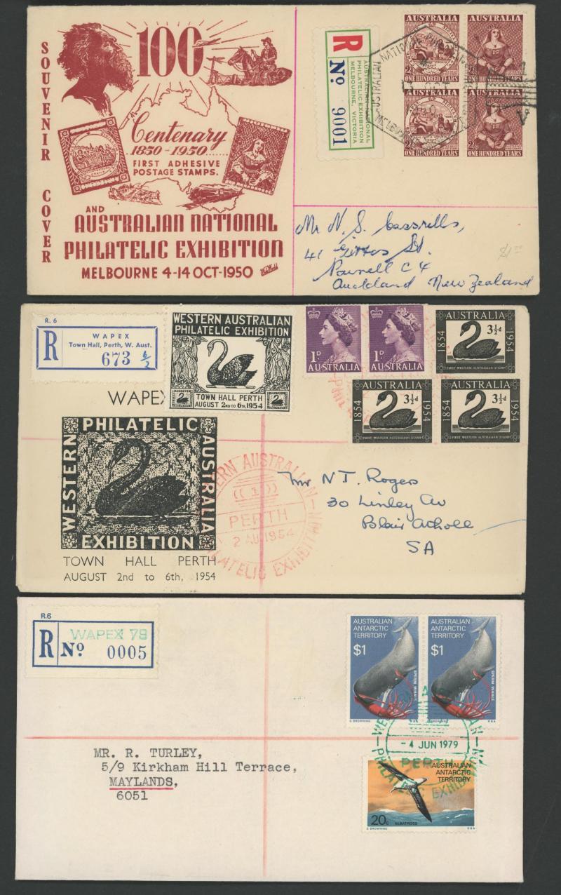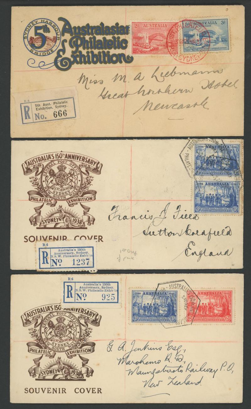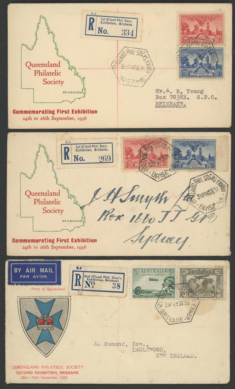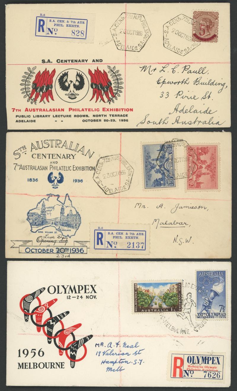 Philatelic Exhibitions registered group including 1932 Sydney, 1936 SA Centenary x2 different illustrated covers, 1936 Brisbane x2,