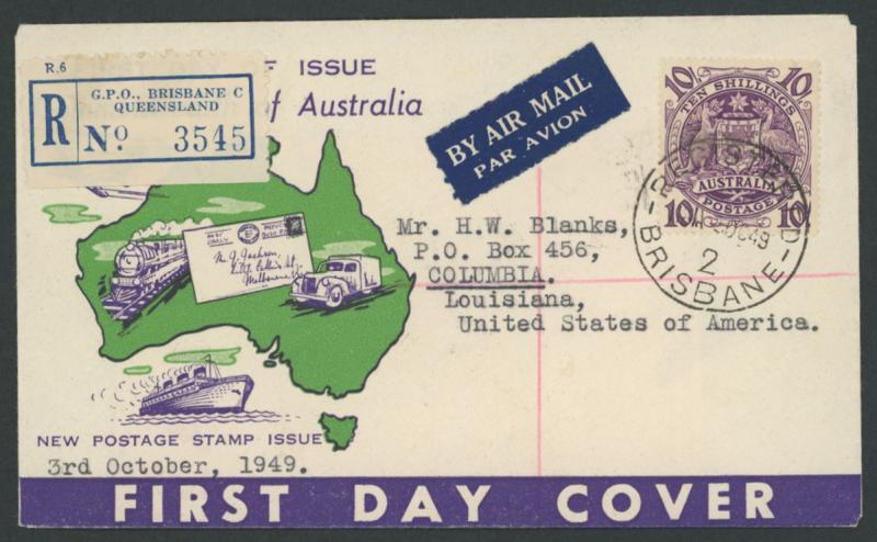 1948-56 Coat of Arms 10/- purple tied to generic illustrated FDC by very fine 'REGISTERED/30OC49/2/ BRISBANE' cds, registered