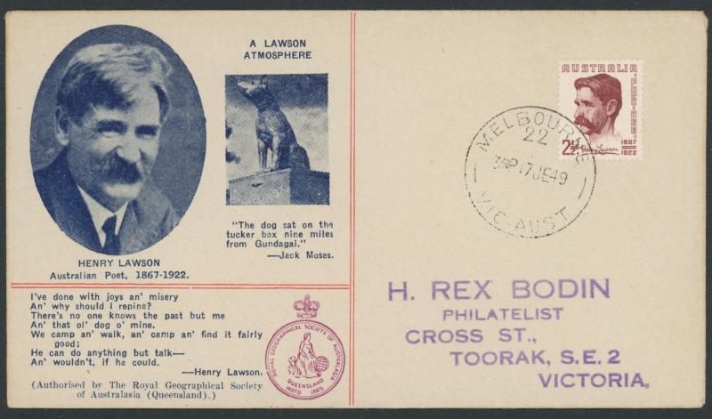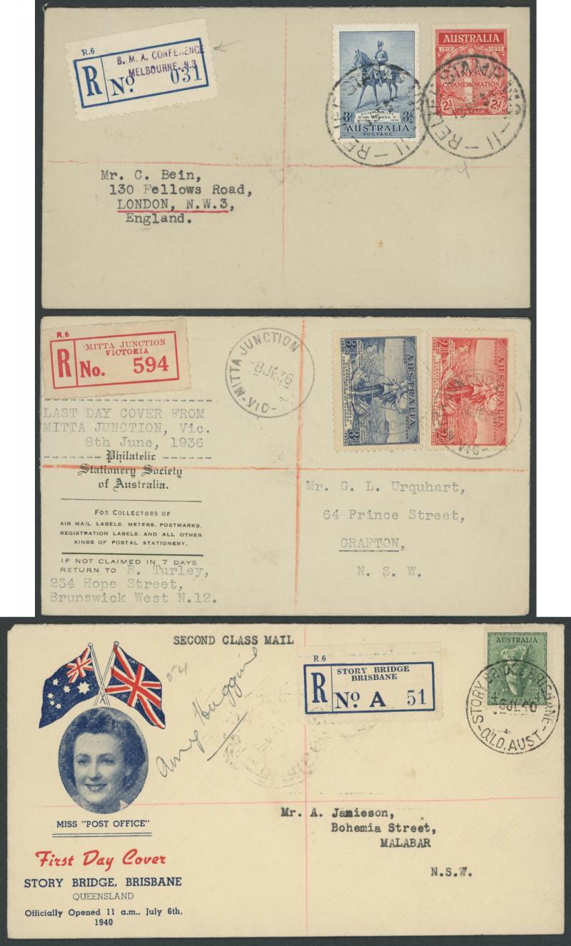 blue/white R label, 1936 Last Day of Post Office with 'MITTA JUNCTION [ ]/VIC' cds [mis-spelled 'RESEVOIR' excised] and red/white R label, 1940 'STORY BRIDGE BRISBANE' on illustrated cover autographed by Miss Post Office "Amy Huggins", 1956
