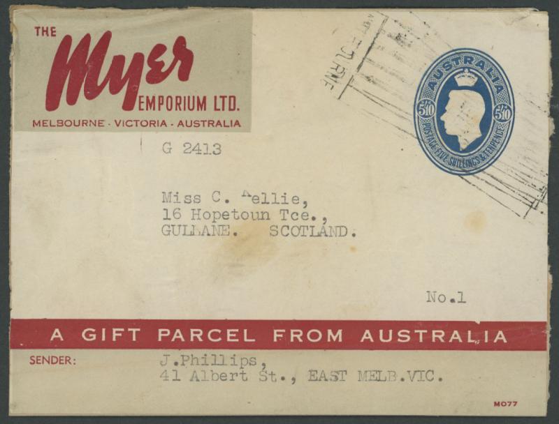 FOOD PARCEL LABELS: 1946 5/10d blue for The Myer Emporium Ltd with 'A GIFT PARCEL FROM AUSTRALIA' at the Base ACSC PL4A with