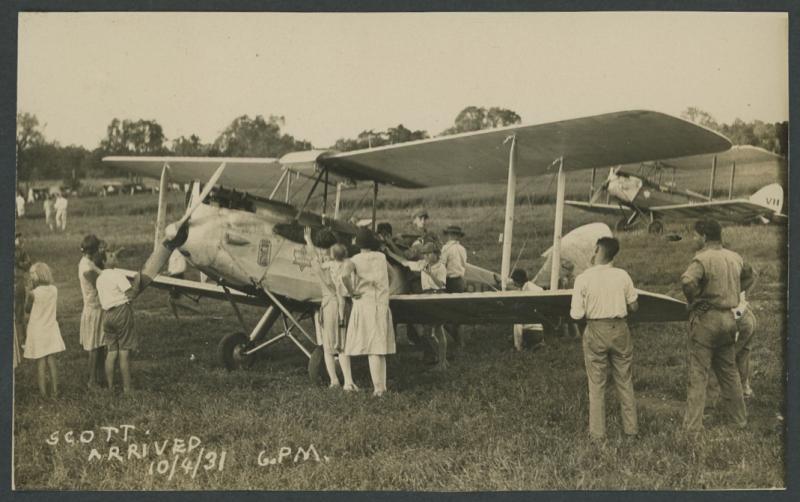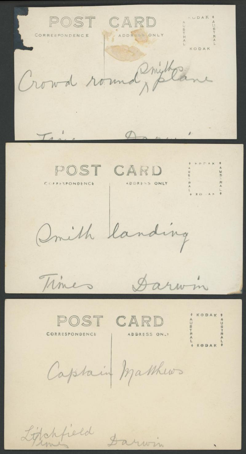 flying suit), two filing holes clear of the image; 1931 superb PPC-size photograph '[CWA] Scott Arrived 10.4.31 6PM' (wellwishers around the plane in a heavily-grassed field); and 1931 Kingsford Smith's & FJ Matthews' arrival at Darwin seven PPCs