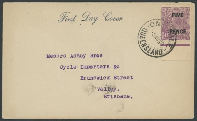 1930 KGV Surcharges 'FIVE PENCE' on 4½d Die II with margin and jubilee line at base tied to plain envelope with 'First Day Cover'