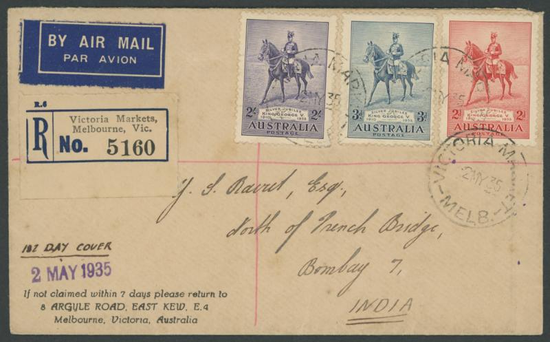 1935 Silver Jubilee 2d 3d & 2/- ACSC 168y tied by 'VICTORIA MARKET/2MY35/VIC' cds to registered airmail cover to India, 'GRANT ROAD
