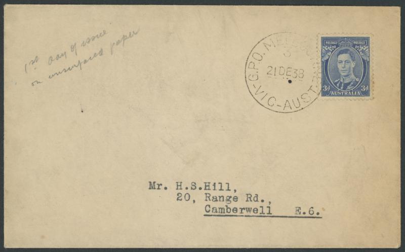 1938 3d KGVI blue Die II (unsurfaced paper) ACSC 194y on plain cover tied by 'G.P.O. MELBOURNE/ 21DE38/VIC-AUST' cds, some light