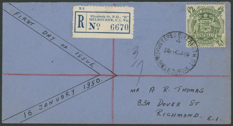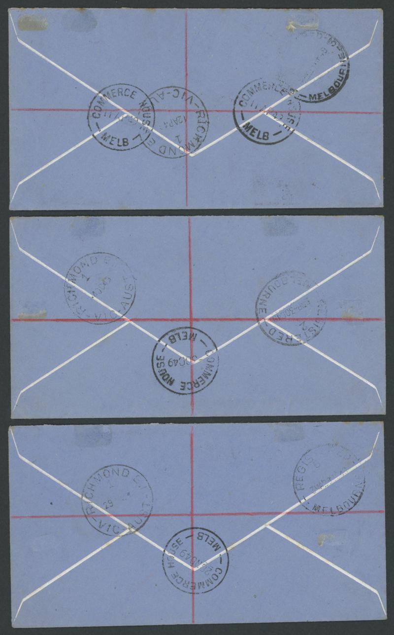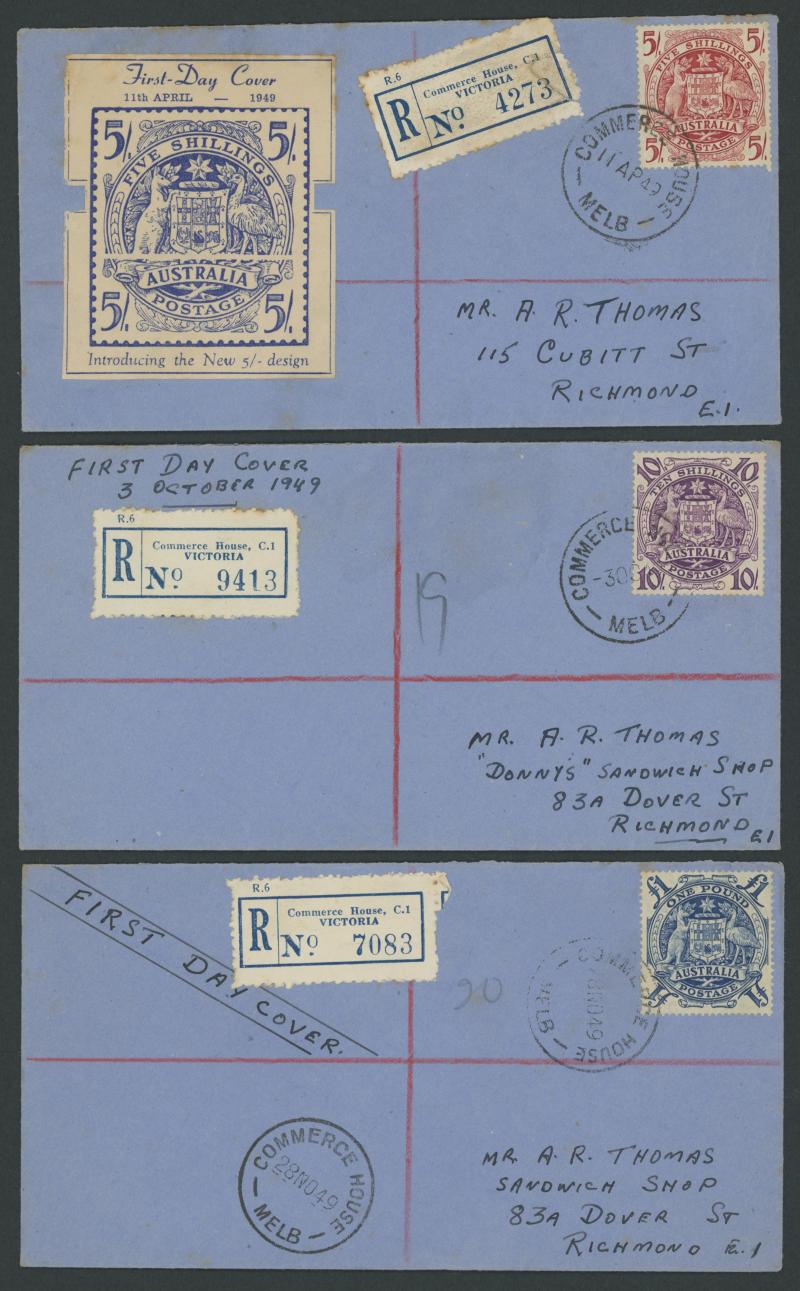 1949-50 Coat of Arms 5/- 10/- £1 & £2 on hand-made envelopes ACSC 268y-271y with 'COMMERCE HOUSE/MELBOURNE' or 'REGISTERED