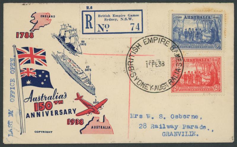 blue (a few aged perfs) on 'Australia's 150th Anniversary' illustrated envelope with typed endorsement "Last Day Office Open", 'British Empire Games/Sydney, N.S.W.' blue/white registration label also tied by the cds, another superb strike of the