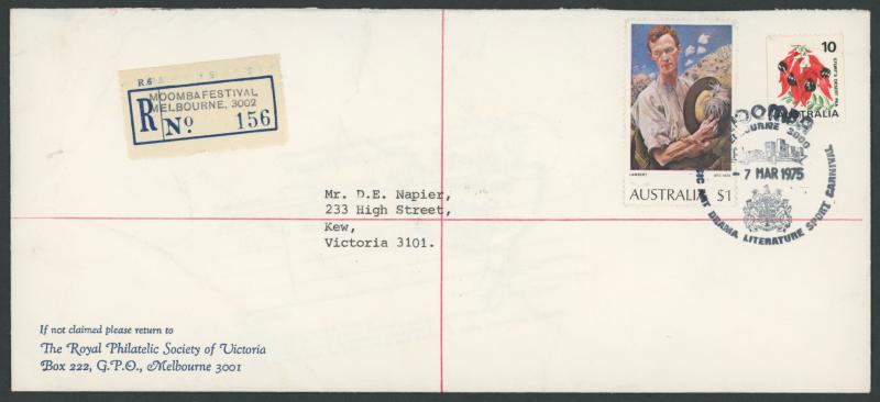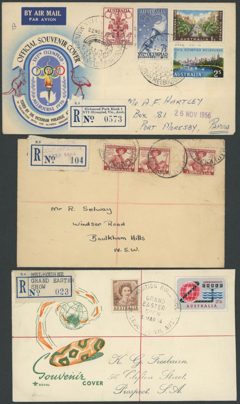 Olympics 'Richmond Park Kiosk 1/XVI Olympiad, Vic, Aust' R label on illustrated cover to PNG with '... MAIN STADIUM ...' pictorial cancels, also 1958 French Fair Melbourne, 1959 ECAFE Broadbeach, Qld, 1964 Grand Easter Show Melbourne, 1965 Law