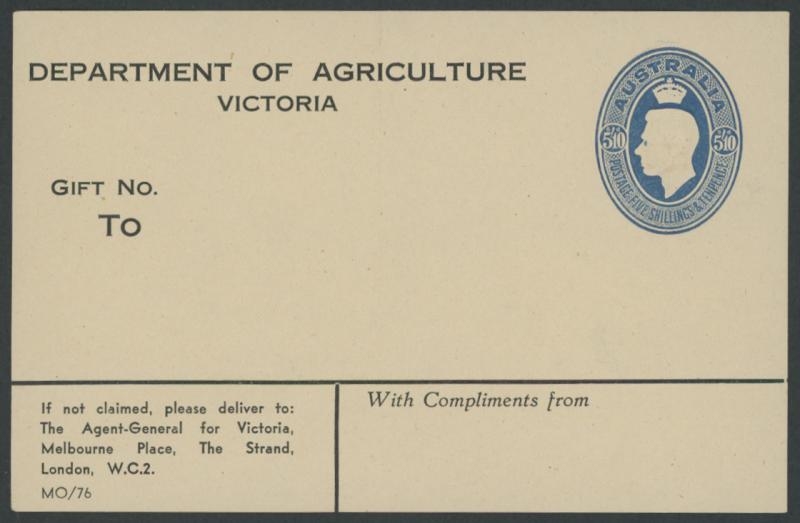 FOOD PARCEL LABELS: 1947 'DEPARTMENT OF AGRICULTURE/VICTORIA' 5/10d dark blue with 'MO/76' printer's mark at lower left ACSC PL4B,