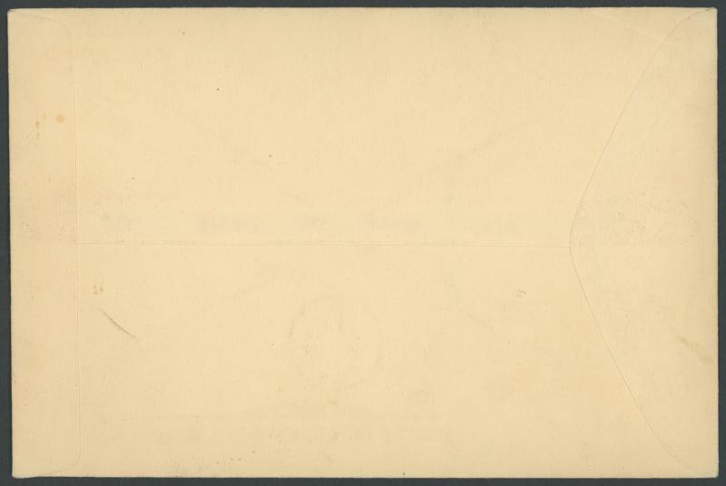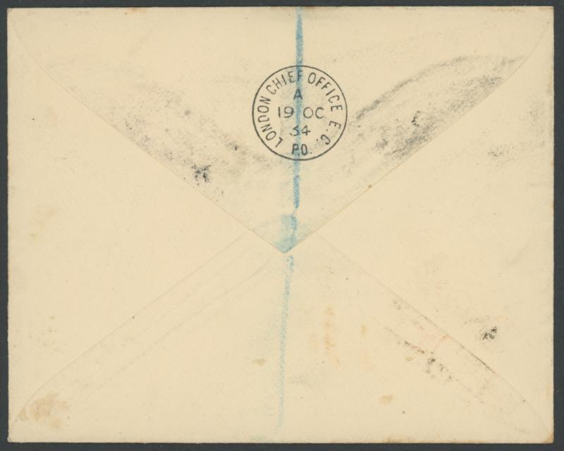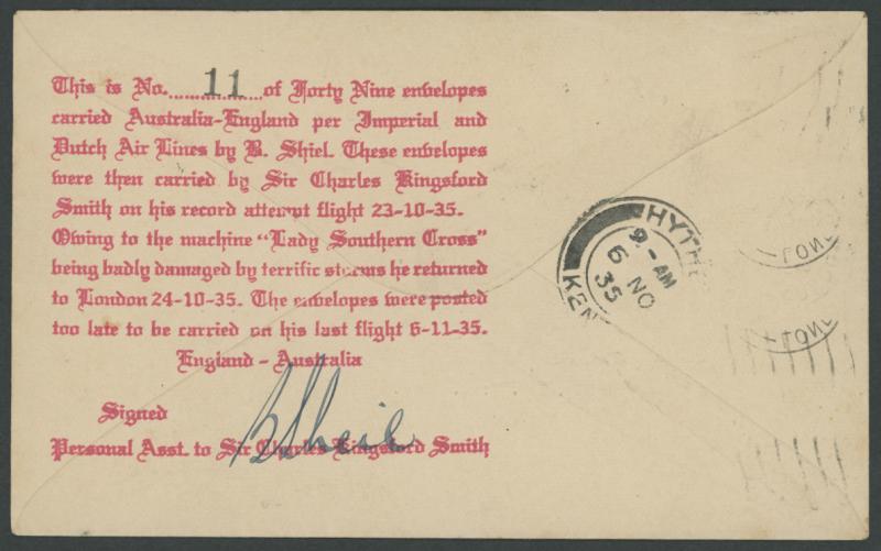 of damage caused by a hail storm. The plane returned to England where a second 1½d was added & tied 'HYTHE/9-AM/6NO/35/KENT' backstamp three hours after Kingsford Smith had departed from there, huge explanatory cachet in red on the reverse numbered