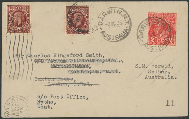 'DARWIN NT/3OC35/AUSTRALIA' cds & London arrival machine of '18OCT/1935', Great Britain KGV 1½d brown with 'VO/CoL' perfin of Vacuum Oil for the return flight tied by London cds of '18OC/35', flight departed 23.10.1935 but aborted at Brindisi because