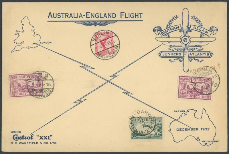 Expedition AMC 242 with Airmail 3d green tied by 'DARWIN NT/12DE32/AUSTRALIA' cds with 'DARWIN, N.T.' cachet alongside, Netherlands Indies Airmails 10c violet x2 tied by Soerabaja cds of '13.12.32' or '10.4.33', and Germany Airmail Eagle 10pf red