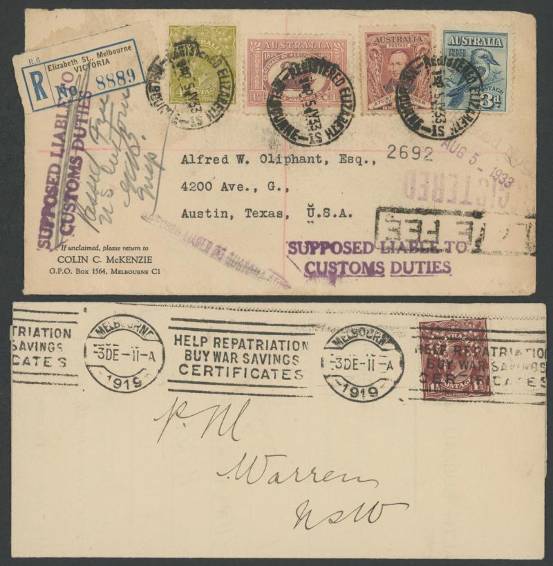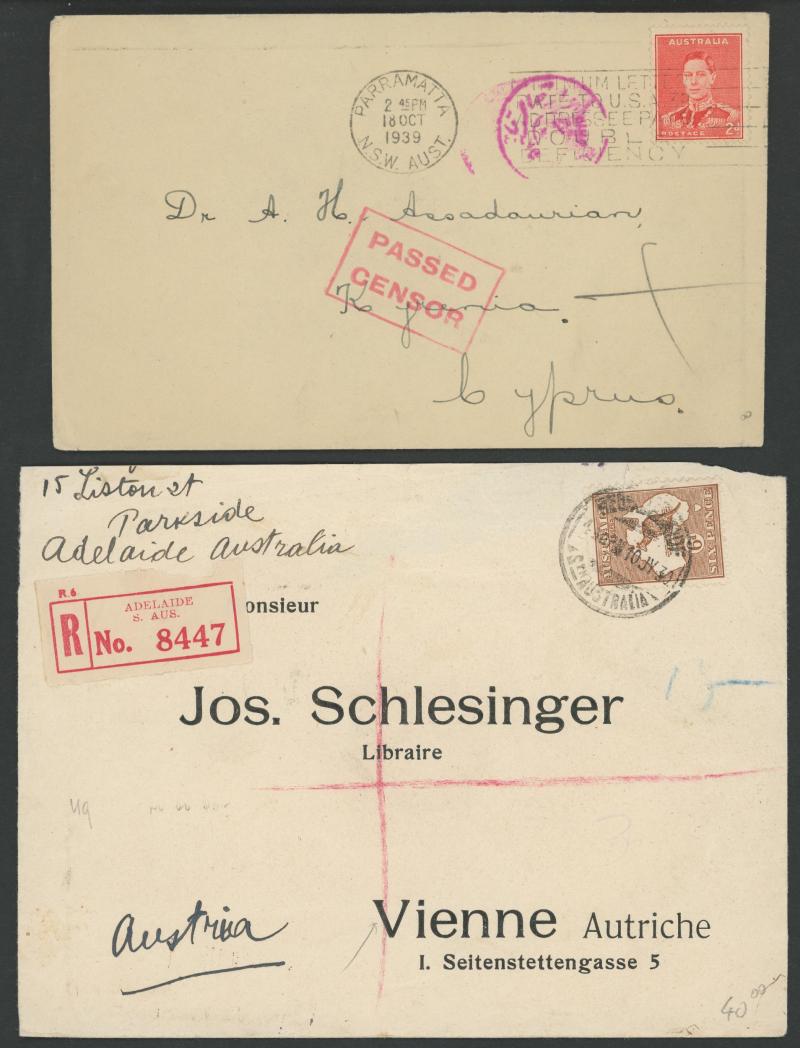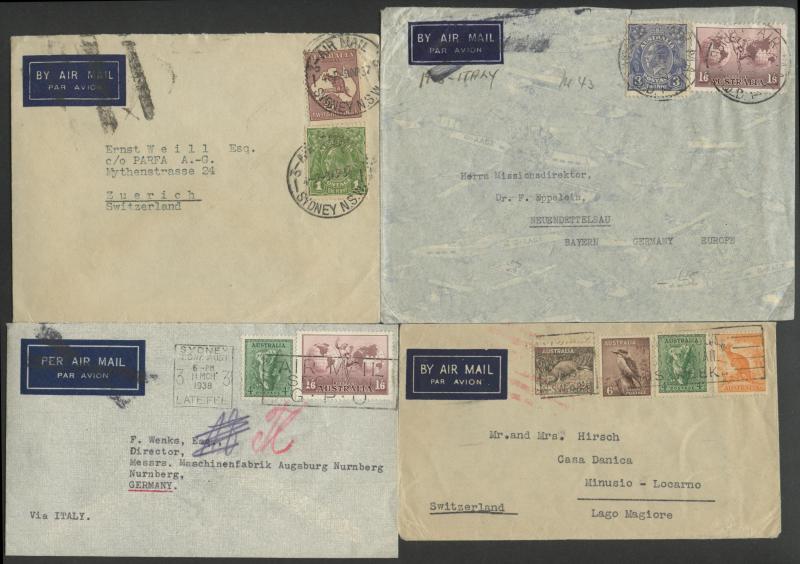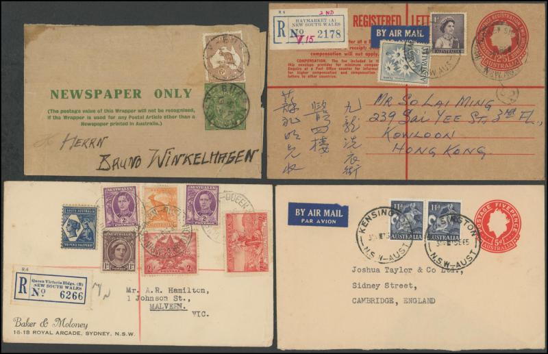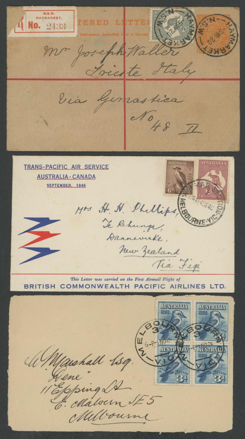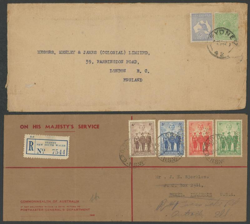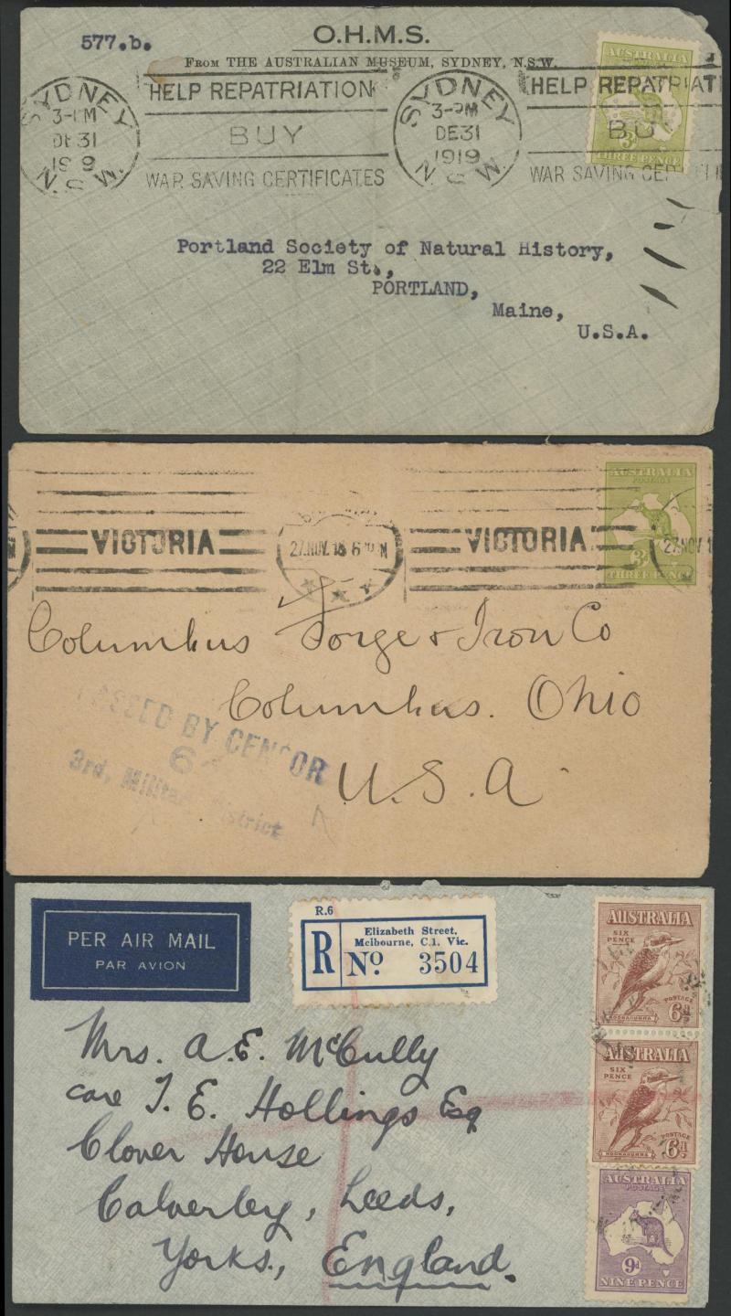 1919 to GB with Kangaroo 6d blue & KGV 1d red, 1931 registered to French India, 1938 airmail to China at 1/- + 3d registration, 1939 airmail postcard to Germany at 11d, 1940 OHMS triple 3d rate to USA with AIF set punctured 'G/NSW' + 3d registration,