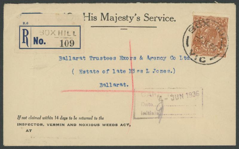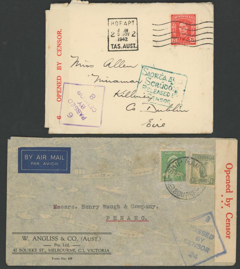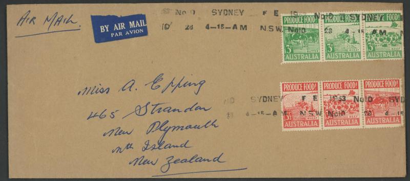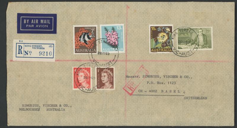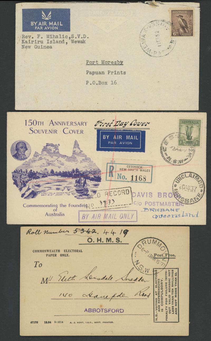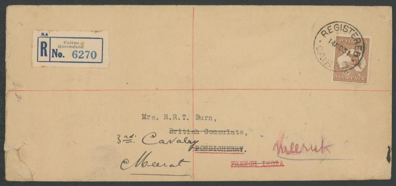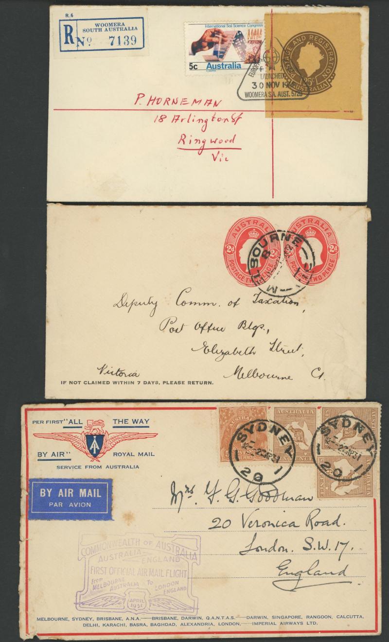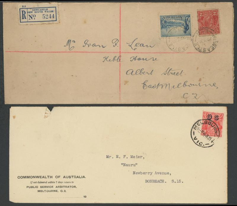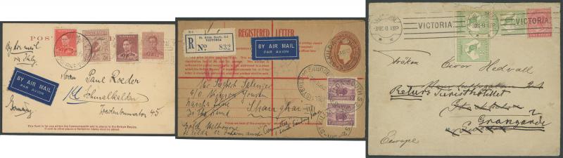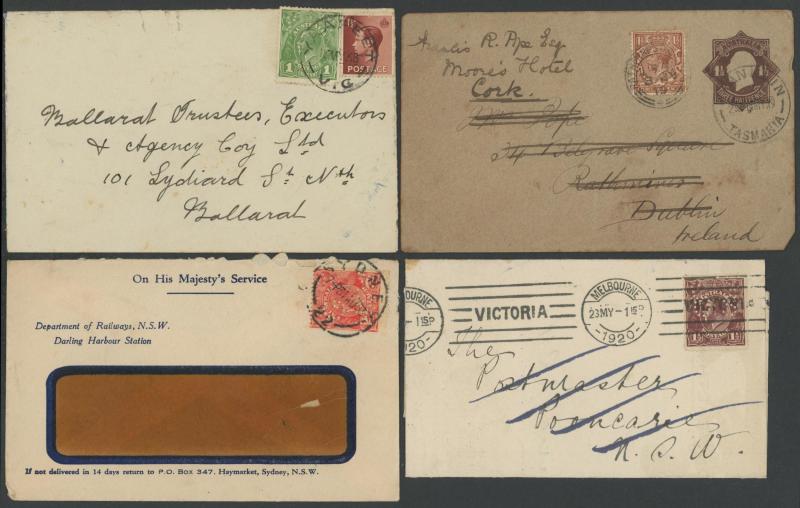 1919 to GB with Kangaroo 6d blue & KGV 1d red, 1931 registered to French India, 1938 airmail to China at 1/- + 3d registration, 1939 airmail postcard to Germany at 11d, 1940 OHMS triple 3d rate to USA with AIF set punctured 'G/NSW' + 3d registration,