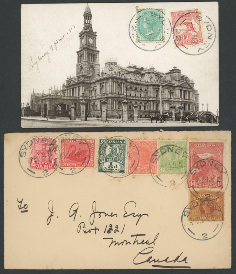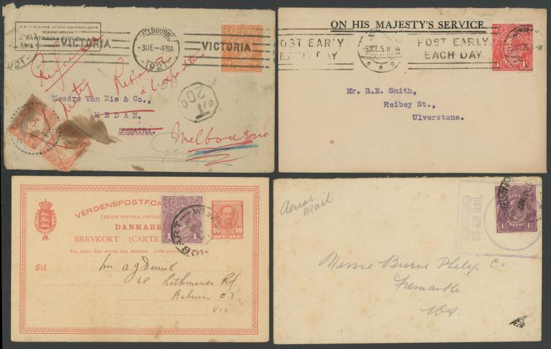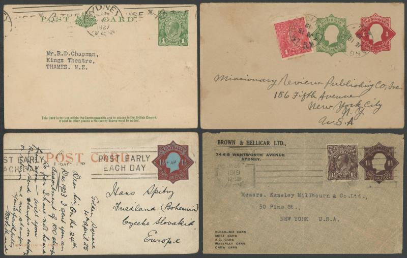 Commonwealth of Australia/State combination frankings comprising PPCs from NSW x2 (one with Esperanto message), Postal Card