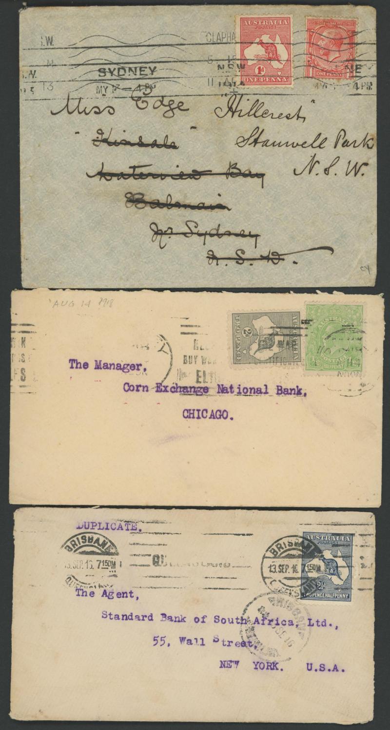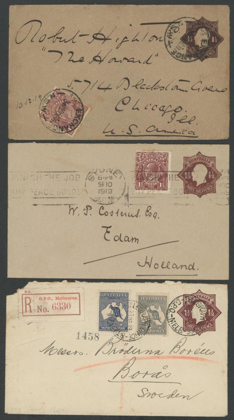 Interesting little group including 1913 to Sweden with Kangaroo ½d x3 & South Australia 1d, 1919 2½d + ½d War Tax to Holland & USA,